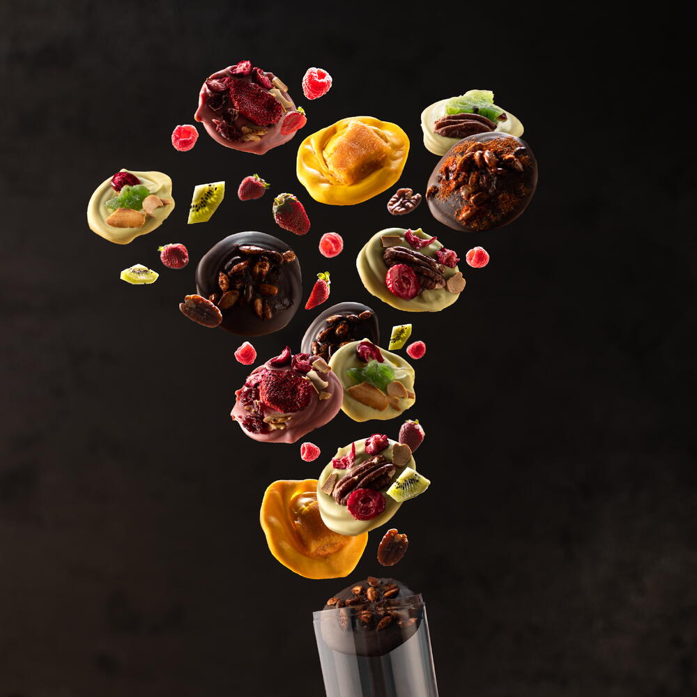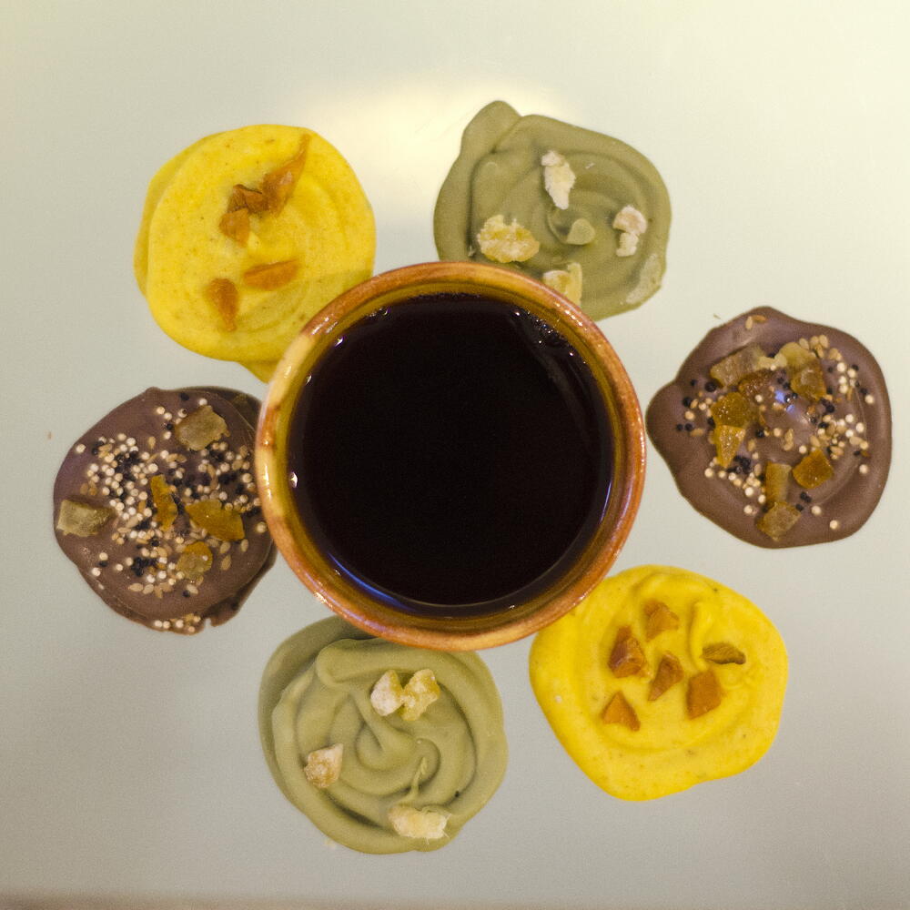 Белый шоколад, молочный шоколад ,куркума, карри, сушёное манго, матча, цукаты имбиря, киноа, кунжут, апельсиновая цедра, эфирное масло мяты