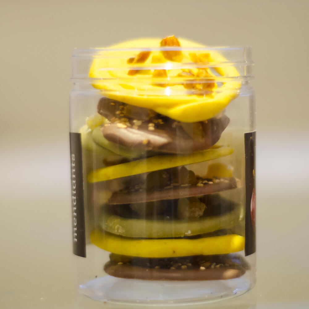 A gift set of three vibrant flavors – warm, fresh, and sunny – like little joys gathered in one box. Each médiant is handmade from premium Belgian chocolate. Whats inside: White chocolate with turmeric, curry, coriander, and mango. A warm, golden médiant with gentle spices and a sunny fruity note. Turmeric and curry reveal themselves delicately, highlighting the sweetness of dried mango. White chocolate with mint, matcha, and ginger. A fresh and invigorating flavor. Matcha provides an elegant green note, mint refreshes, and ginger adds a spicy kick. Milk chocolate with quinoa, sesame, and orange zest. Creamy base, crunchy quinoa, nutty sesame, and a citrus spark – a harmony of textures and aromas. The perfect médiant for those who love cozy and vivid combinations. Why this is a special gift: -Handmade -Premium Callebaut chocolate -Natural spices and candied fruits -Aesthetic presentation -Versatile format – perfect with tea, wine, or just for enjoyment