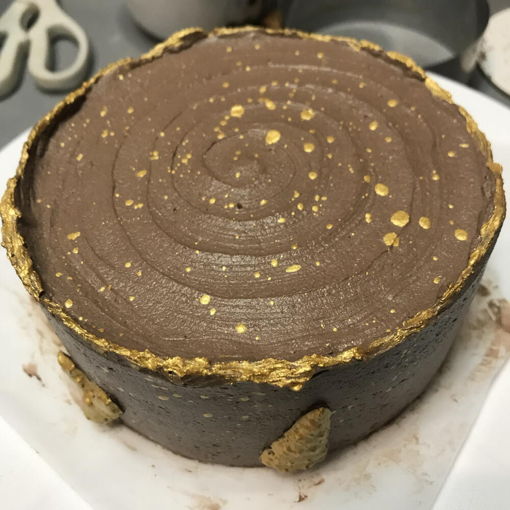 Pan di Spagna al cioccolato (farina di grano tenero, cacao, uova, zucchero, lievito per dolci, burro, latte), crema al cioccolato (panna 30%, cioccolato belga, burro), zucchero a velo, vaniglia, decorazioni per pasticceria