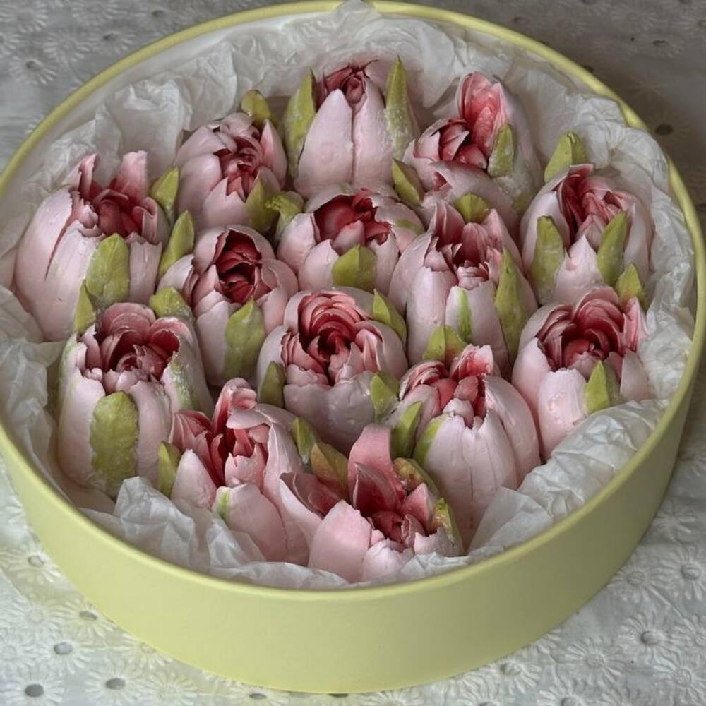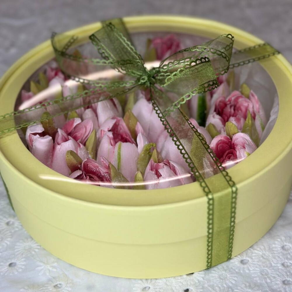 A box of soft, marshmallow-like tulips in delicate blush pink — sweet, airy, and utterly dreamy.