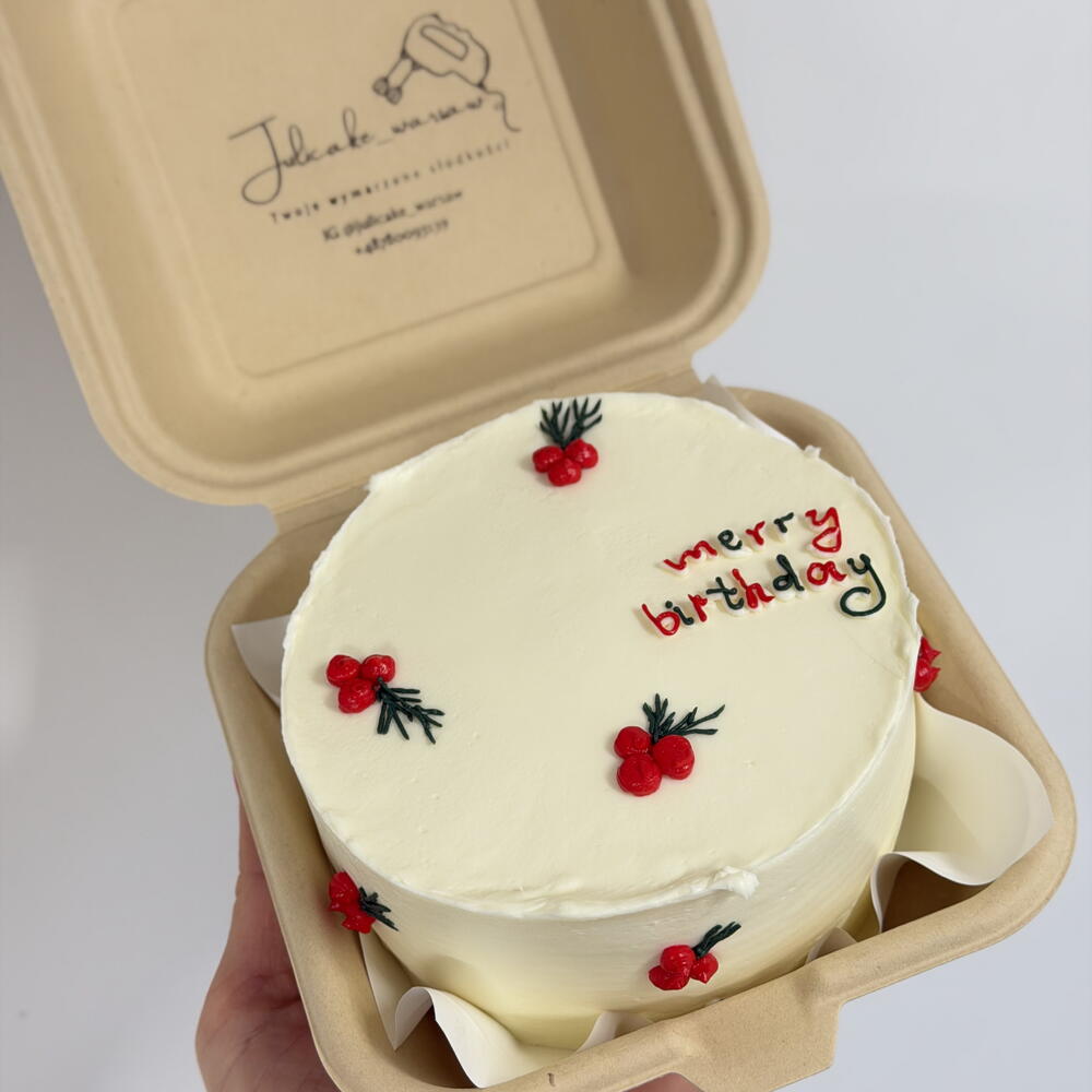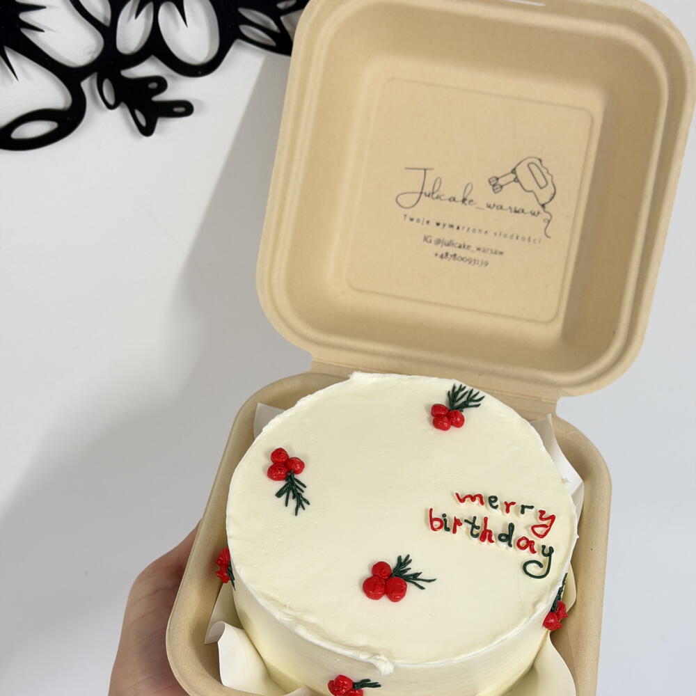 Piccola torta ideale per occasioni intime. Sottili strati di pan di Spagna farciti con una crema a base di panna e mascarpone, creano un insieme leggero e piacevole al palato. La torta bento si distingue per la forma minimalista e la possibilità di personalizzare la scritta o la decorazione. È una scelta eccellente per compleanni, anniversari, ringraziamenti o un piccolo regalo — pronta da regalare e comoda da porzionare. Dimensioni: ca. 10–12 cm Numero porzioni: 1–2 Stile: minimalista, moderno Personalizzazione: scritta o decorazione semplice (da concordare)