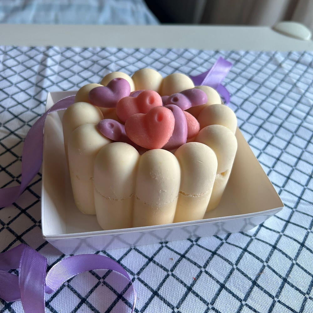 Cioccolato bianco belga, panna, gelatina, pan di Spagna, ripieno di fragole, zucchero, uovo