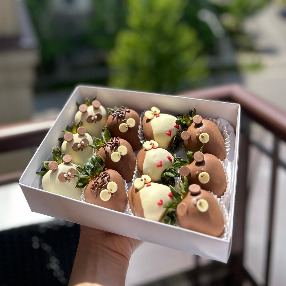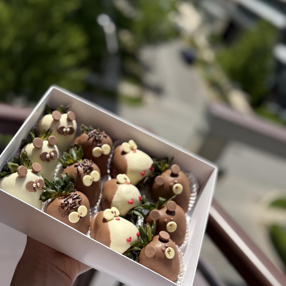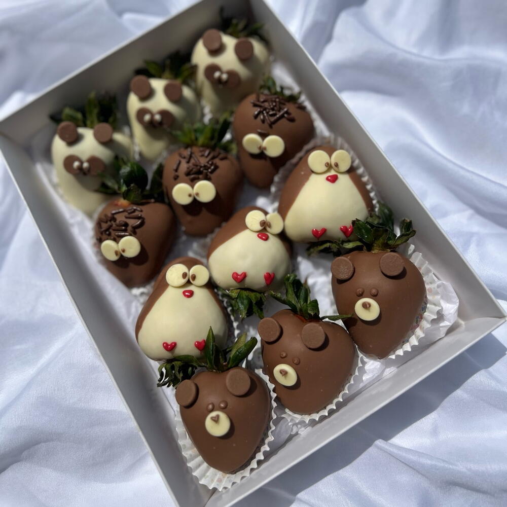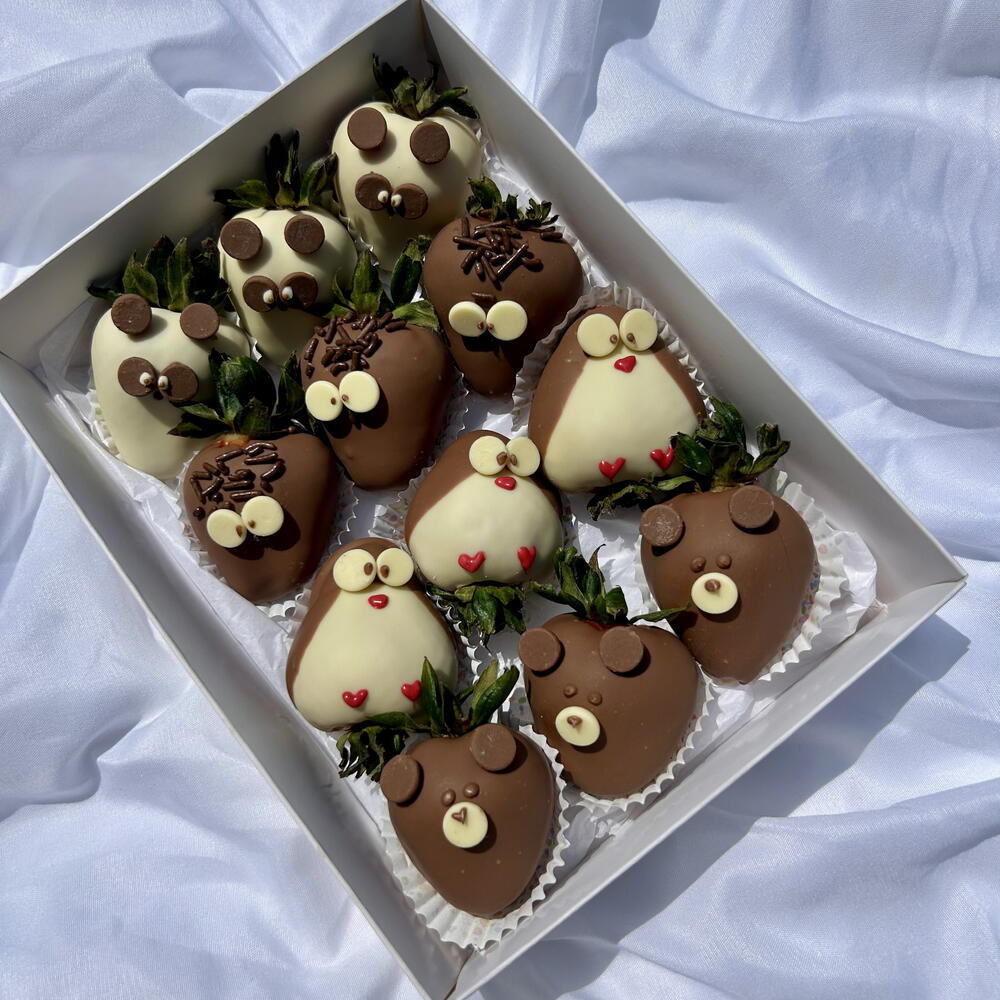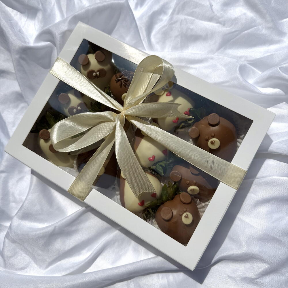 Surprise someone special with a box full of sweetness and smiles! This gift set features a dozen fresh strawberries dipped in premium Belgian milk and white chocolate, each hand-decorated as charming animals like pandas, penguins, owls, and bears. Perfect for birthdays, baby showers, anniversaries, or simply to brighten someone’s day. Every strawberry is crafted with care and love, making it a unique and delicious gift for any occasion.