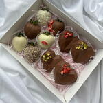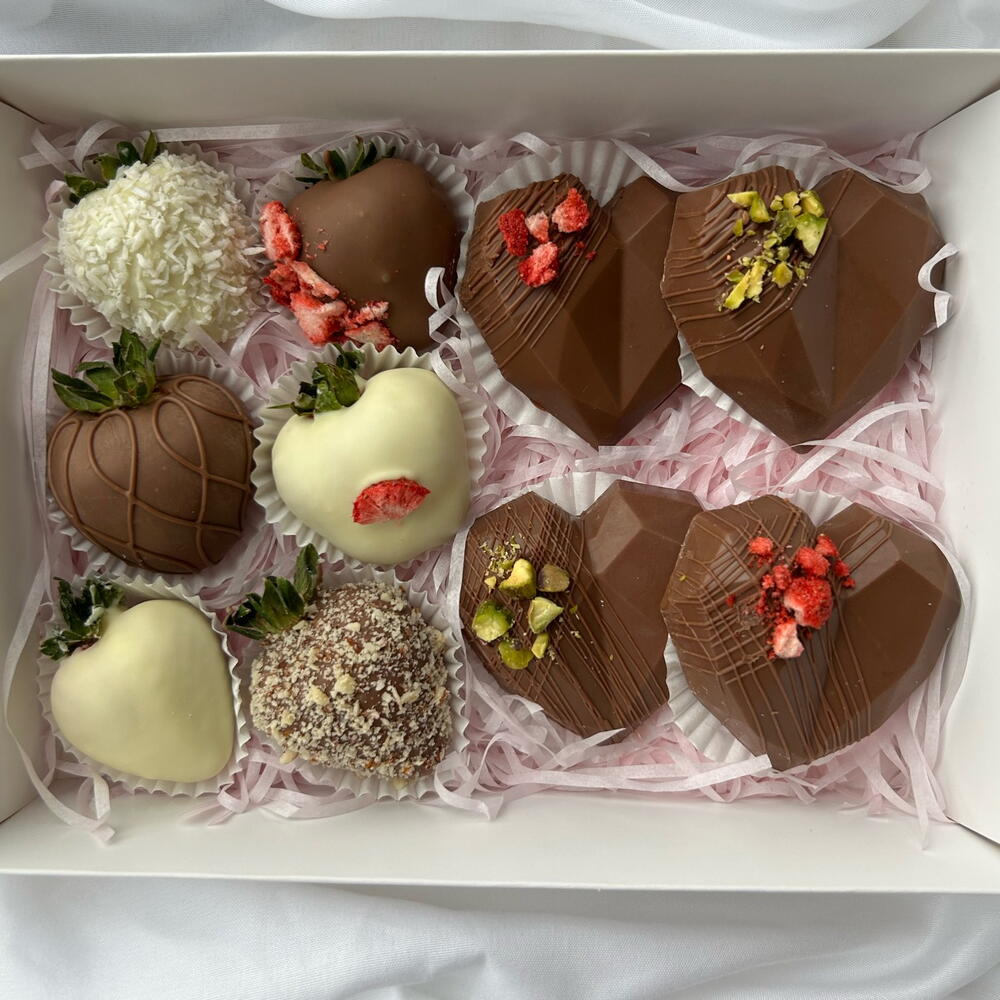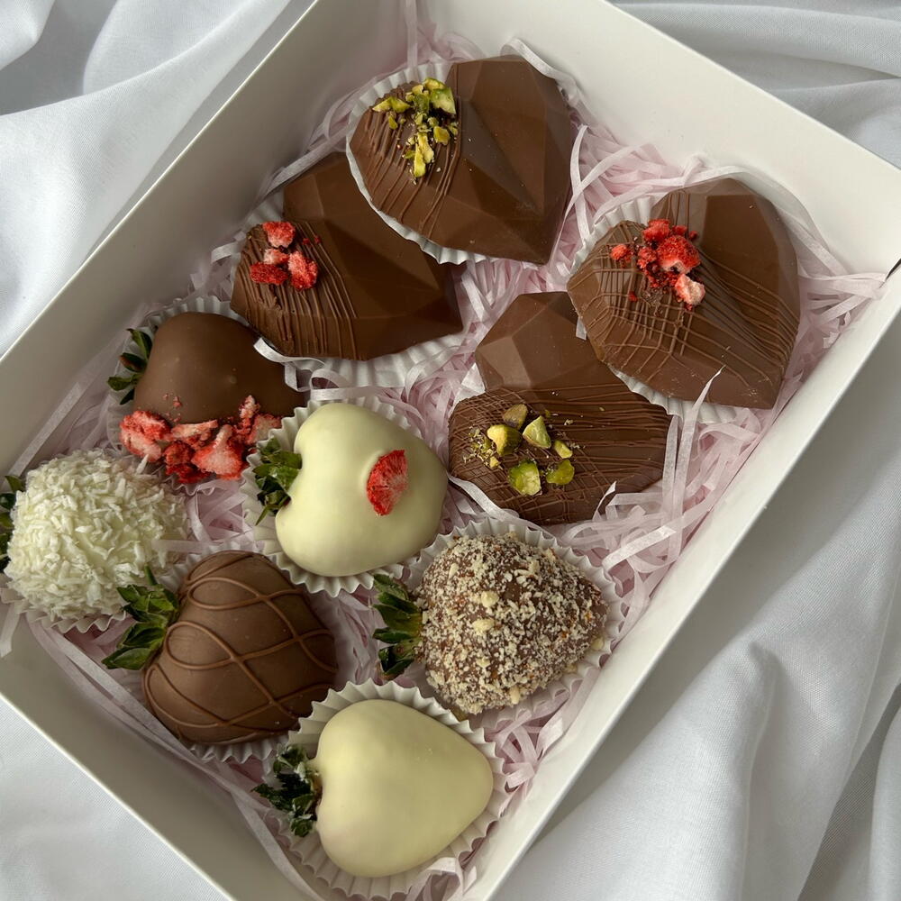 This delightful combo features four heart-shaped Dubai chocolates paired with six exquisite strawberries dipped in smooth milk and white Belgian chocolate. Perfectly crafted for special occasions or as a luxurious gift, this set combines the rich, indulgent flavors of Dubai chocolate hearts with the freshness of juicy strawberries, creating an unforgettable treat for any chocolate lover. Beautifully presented and ready to enjoy!