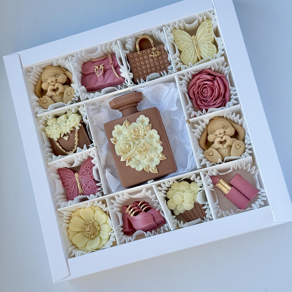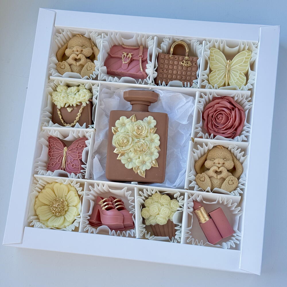 Una elegante scatola di cioccolatini artigianali ispirata al mondo della moda e della bellezza di lusso. Ogni pezzo è attentamente progettato a forma di profumi, rossetti, borse e delicati fiori, rendendolo allo stesso tempo un dessert e un'opera d'arte. La morbida palette pastello con accenti dorati crea una presentazione sofisticata, degna di un regalo. Perfetta per occasioni speciali, celebrazioni o per una dolce sorpresa davvero elegante. ✨🍫