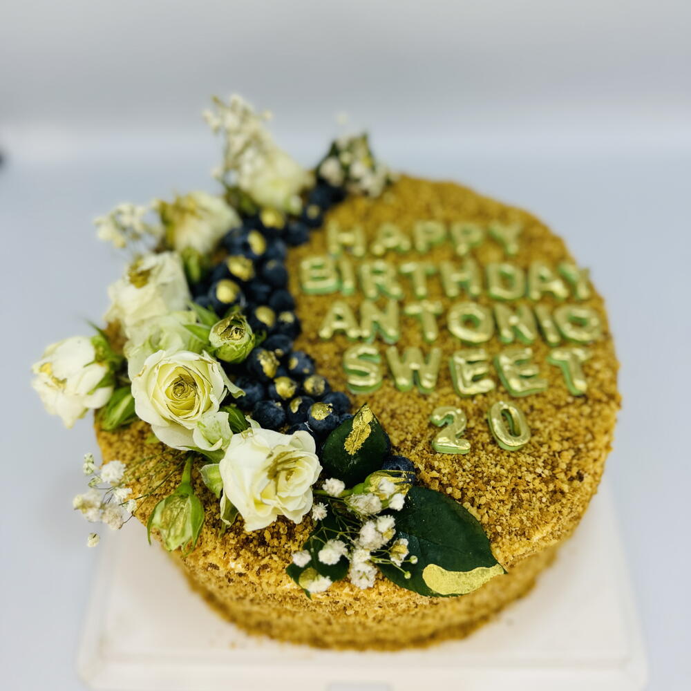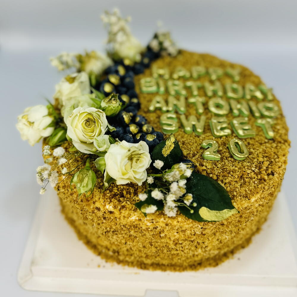 Medovik honey cake vs smetana cream decorated vs fresh flowers and blueberry