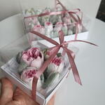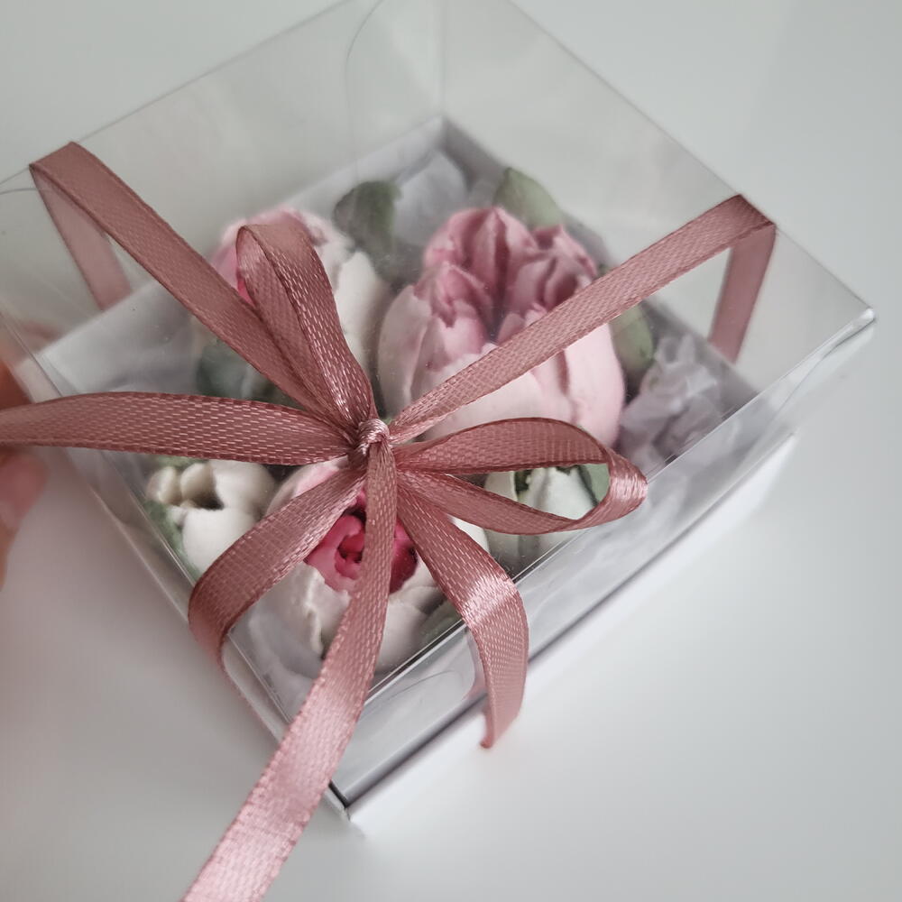 Kompozycja z tulipanami z zefiru — elegancki, ręcznie wykonany słodki prezent. Zefir wykonany jest w 100% z naturalnych składników. W składzie: puree owocowe, białko pasteryzowane, cukier oraz agar. Produkt charakteryzuje się lekką konsystencją oraz stosunkowo niską kalorycznością w porównaniu do tradycyjnych słodyczy. Konsystencja — lekka, puszysta i rozpływająca się w ustach. Kompozycja jest estetycznie zapakowana i gotowa do wręczenia. Każdy box powstaje ręcznie, dlatego nie jest możliwe stuprocentowe odtworzenie kompozycji. Układ kwiatów, ich forma oraz odcienie mogą się nieznacznie różnić od przedstawionych na zdjęciu — to naturalna cecha rękodzieła i gwarancja unikalności każdej realizacji. Waga produktu jest przybliżona, ponieważ kompozycja składa się z ręcznie wykonanych elementów i ich liczba może się nieznacznie różnić.