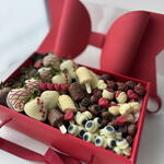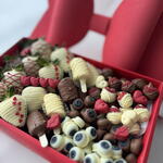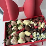 includes: • 24 strawberries enrobed in rich milk and velvety white chocolate • 8 banana pieces dipped in smooth milk and white chocolate • Raspberries with almonds, adding a delightful crunch • Blueberries, perfectly complemented by the creamy chocolate