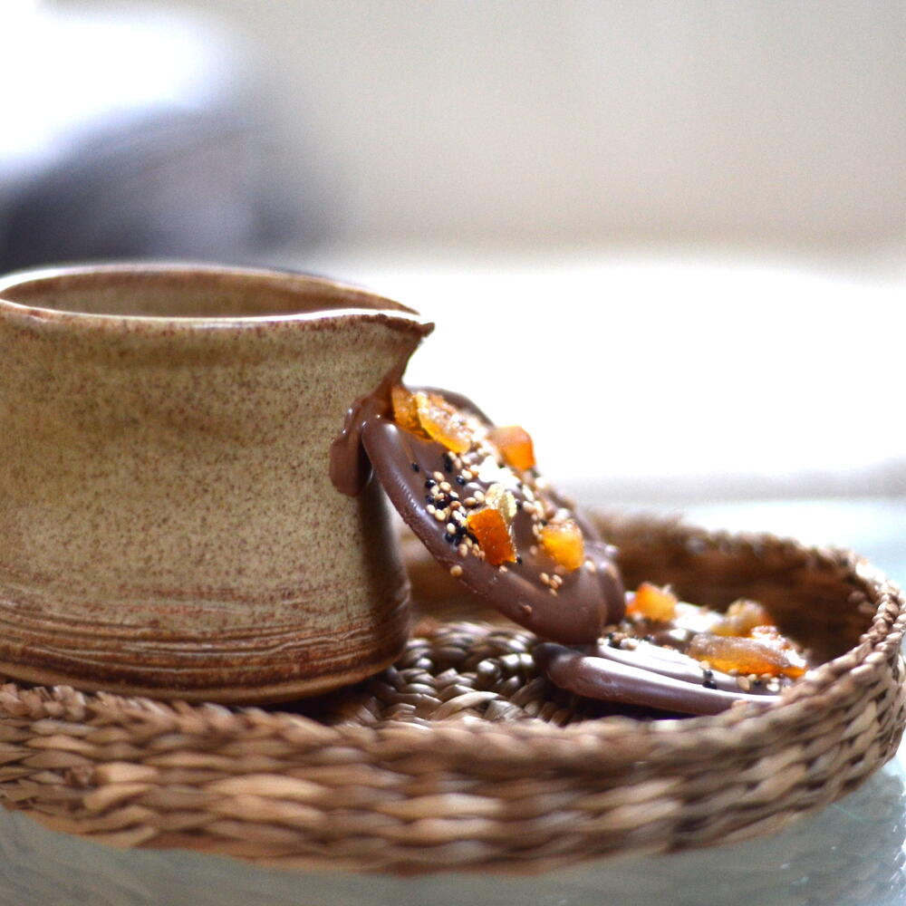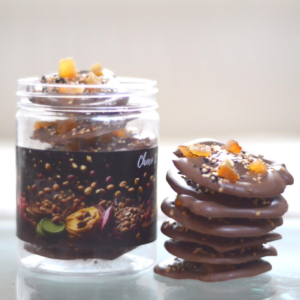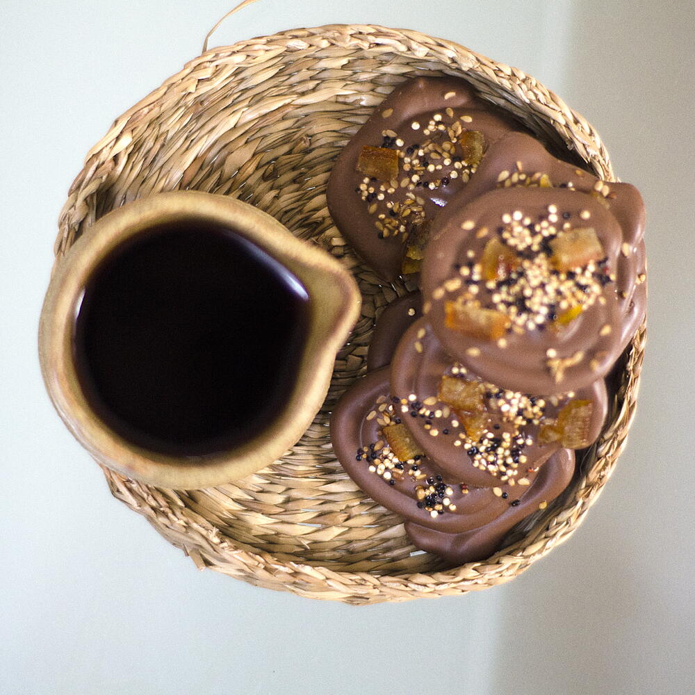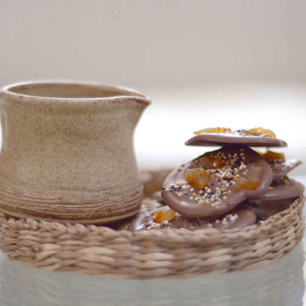молочный шоколад, киноа, кунжут, масло кунжута, цукаты из апельсинов