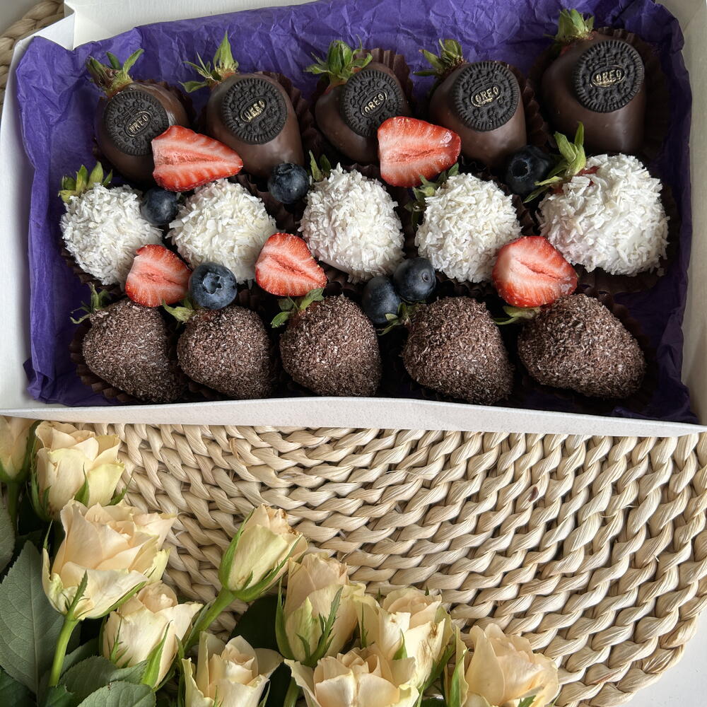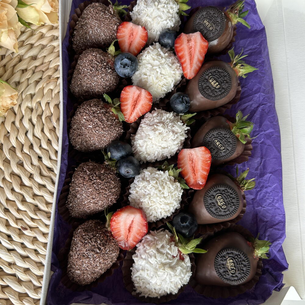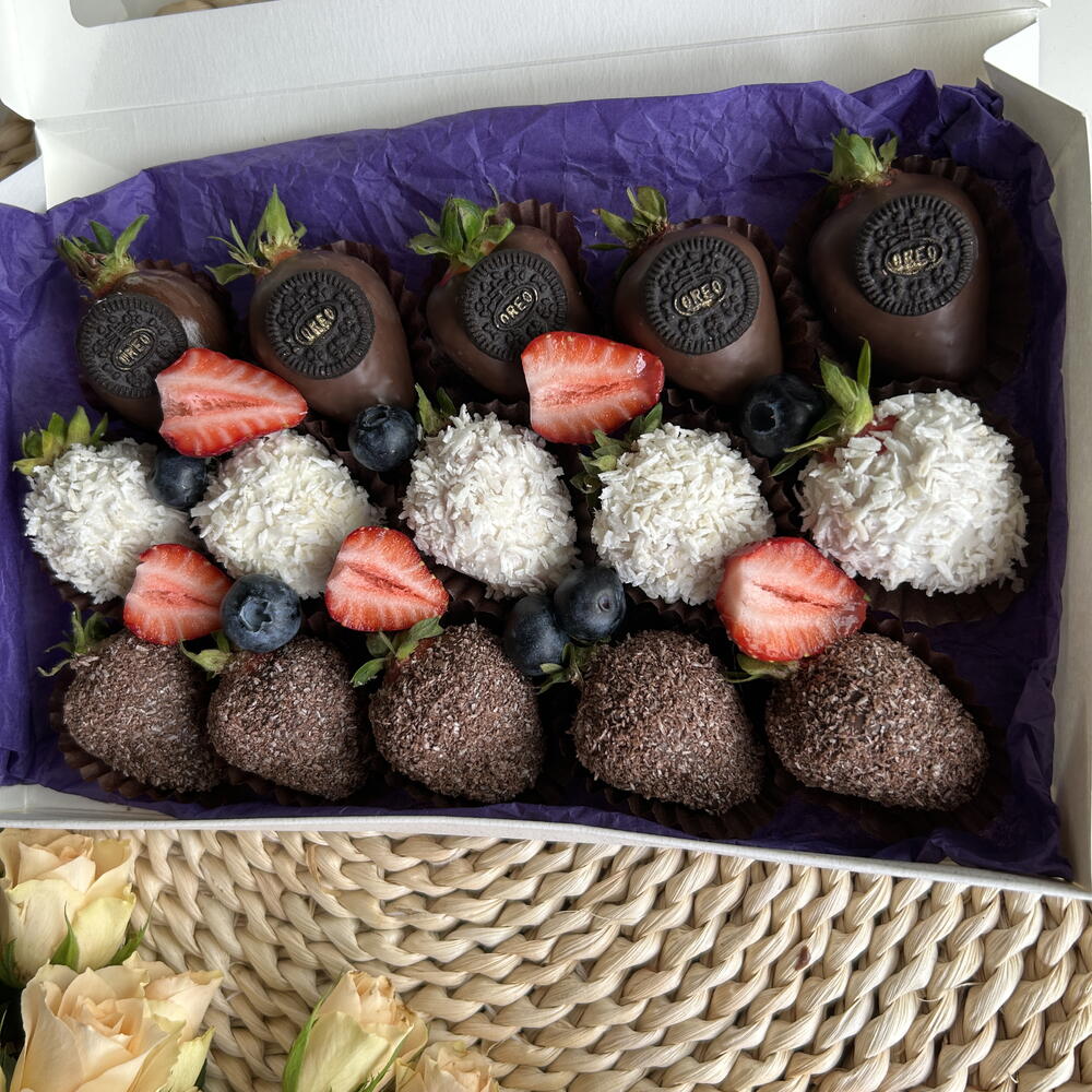 Fragole fresche, cioccolato al latte, fiocchi di cocco,oreo