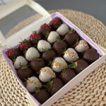 Cioccolato al latte belga, cioccolato bianco belga, fragole fresche.