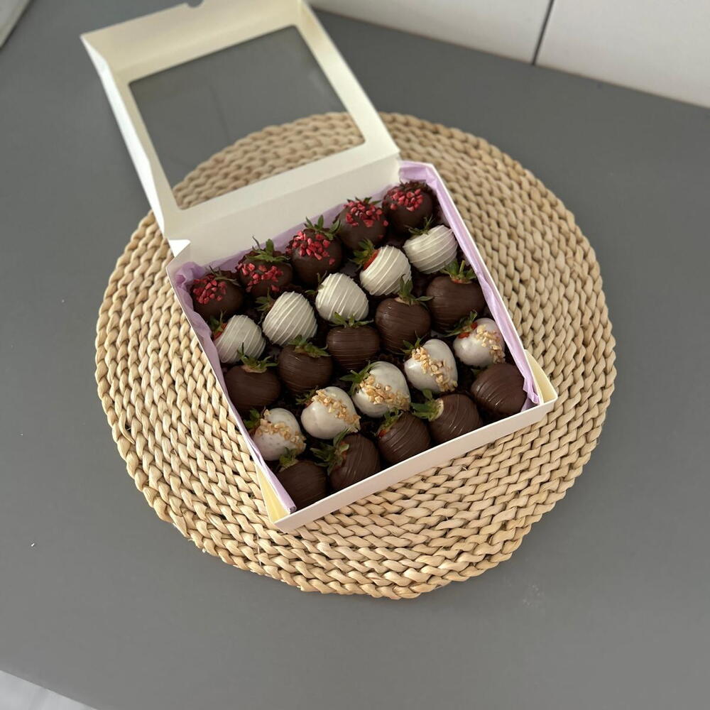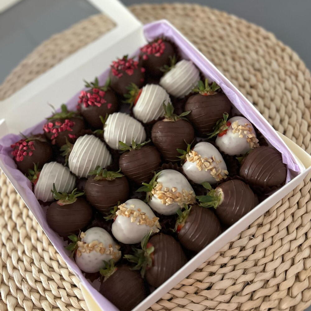 Cioccolato al latte belga, cioccolato bianco belga, fragole fresche.