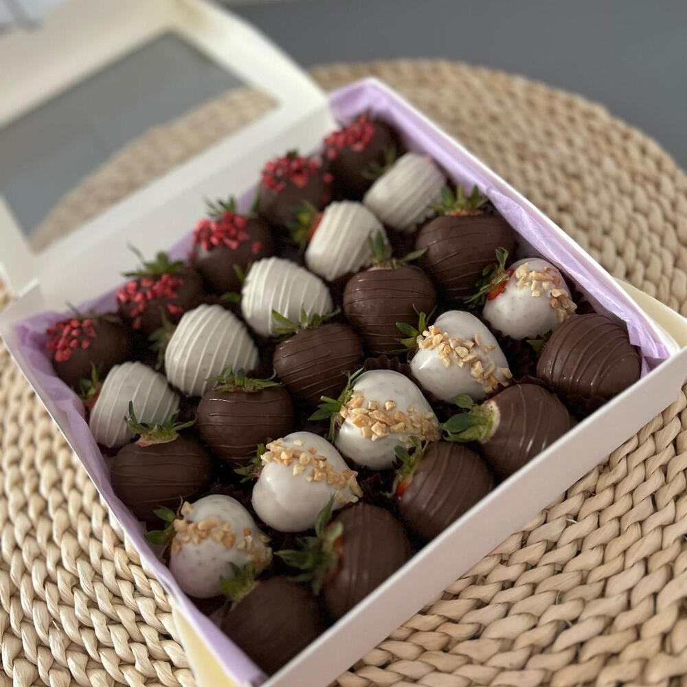 Fragole fresche, cioccolato bianco belga 33% cacao, cioccolato al latte belga 35% cacao, arachidi, lamponi liofilizzati