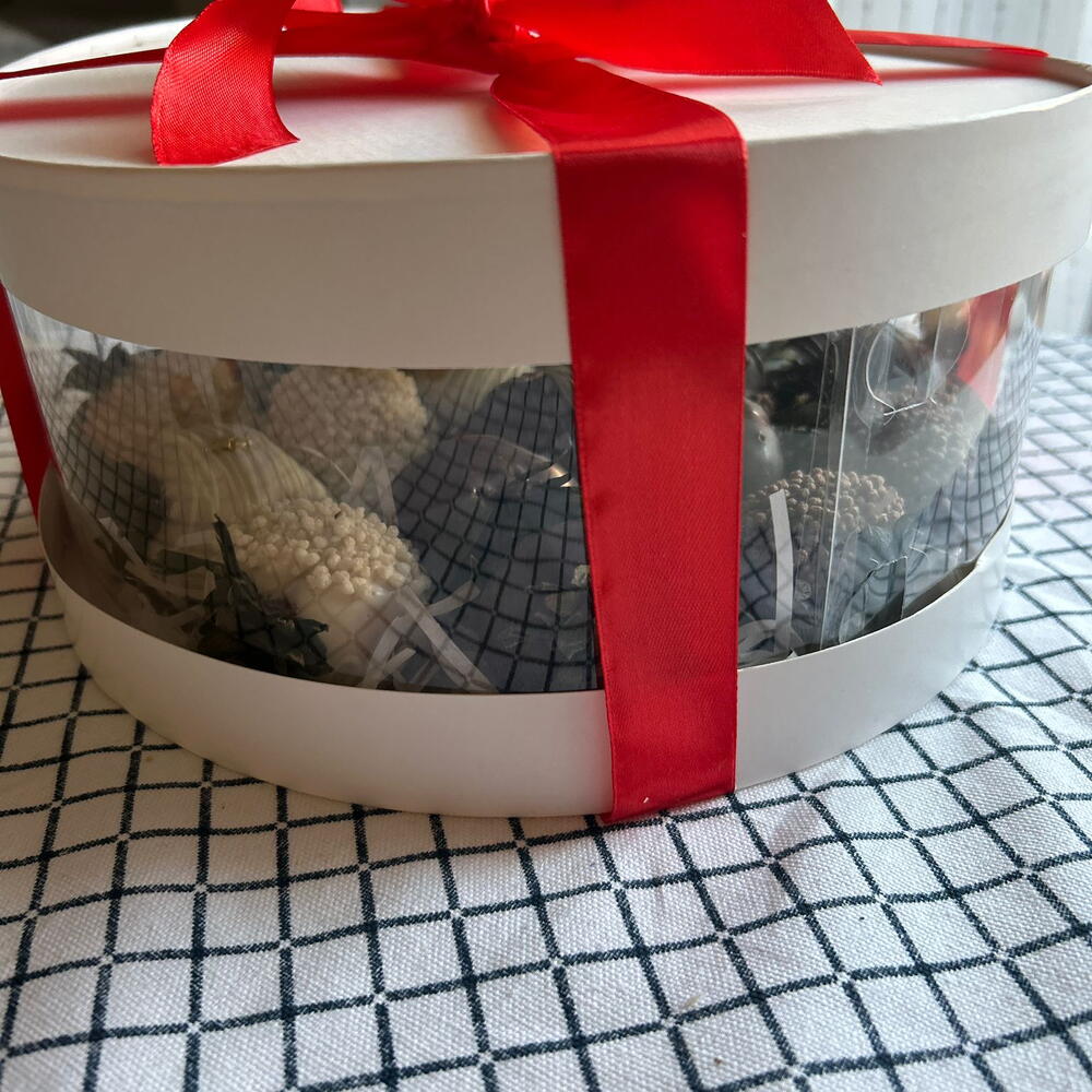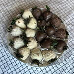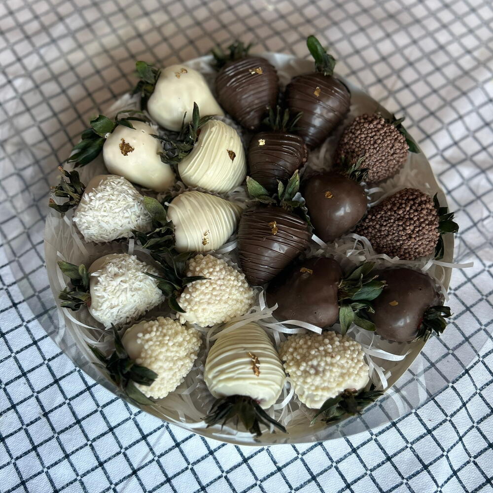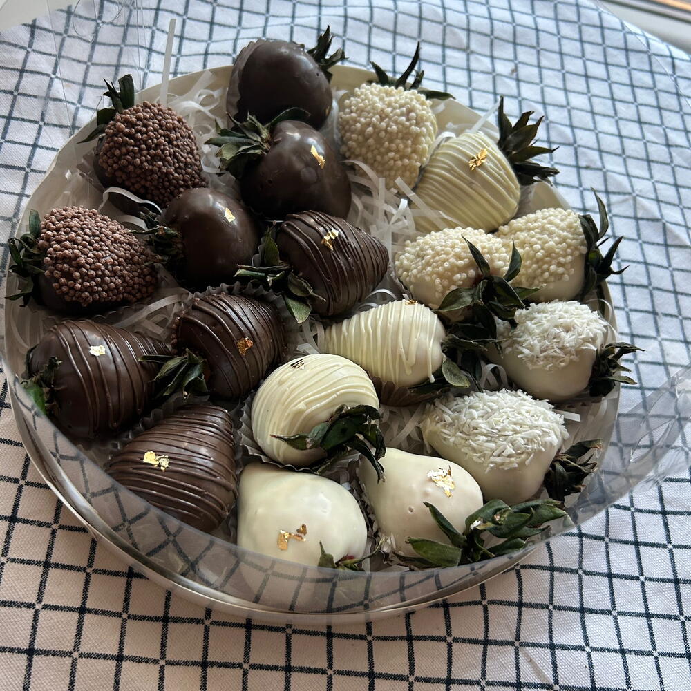 10 fragole fresche ricoperte di cioccolato bianco belga e 10 ricoperte di cioccolato al latte belga. Raffreddare in frigorifero per 24 ore.