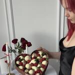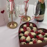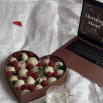 Fragole ricoperte di cioccolato in una scatola a forma di cuore, frutta di stagione
