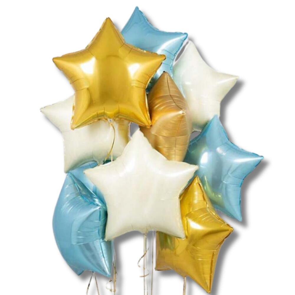 Balloon set of 12 foil stars. Color palette : light blue, cream, gold Number of balloons : 12 pcs Inflated with helium, assembled into a bouquet and attached to a weight.