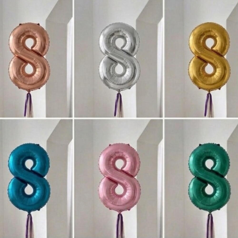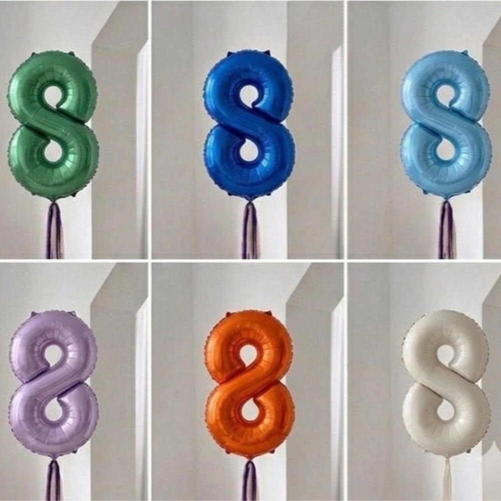 Contenuto del set: 1 x Palloncino in foil: Forma cifra „8” (disponibile in un'ampia gamma di colori) 1 x Nastro: Delicato nastro in tessuto sul fondo del palloncino