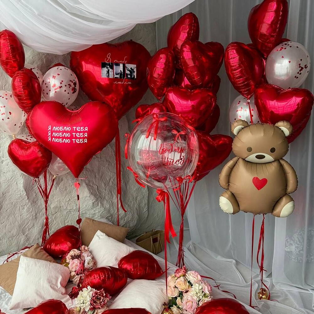 Included in the set: 1 heart 90cm with 3 photos and inscription 1 heart 60cm with inscription 1 figure: teddy bear 1 bubble balloon 60cm with inscription and bows 1 bundle of 10 hearts 45cm 2 bundles of 10 balloons each ( each contains: 4 hearts 45cm, 6 balloons 30cm pink with glitter ) 7 hearts 45cm for the bed 7 weights 6 bags for transportation Total number of balloons: 41 Filling: Balloons for the bed are air-filled, the rest are helium-filled длина, мм: 2000 ширина, мм: 2000 высота, мм: 2000