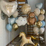 Included in the set: 1 figure: bear 1 figure: cloud 1 standing figure: horse 1 heart 90cm with custom inscription 1 crystal ball 70cm with custom inscription 1 bouquet of 16 balloons ( 2 hearts 45cm , 1 circle with print, 4 balloons 30cm chrome, 9 balloons 30cm pastel) 1 bouquet of 10 balloons ( 1 heart 45cm , 2 balloons 30cm chrome, 7 balloons 30cm pastel) 6 weights 5 bags for transportation Total number of balloons: 31 Filling: All balloons with helium длина, мм: 2000 ширина, мм: 2000 высота, мм: 2000