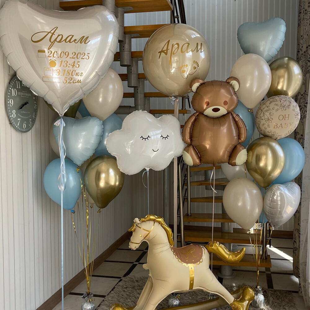 Included in the set: 1 figure: bear 1 figure: cloud 1 standing figure: horse 1 heart 90cm with custom inscription 1 crystal ball 70cm with custom inscription 1 bouquet of 16 balloons ( 2 hearts 45cm , 1 circle with print, 4 balloons 30cm chrome, 9 balloons 30cm pastel) 1 bouquet of 10 balloons ( 1 heart 45cm , 2 balloons 30cm chrome, 7 balloons 30cm pastel) 6 weights 5 bags for transportation Total number of balloons: 31 Filling: All balloons with helium длина, мм: 2000 ширина, мм: 2000 высота, мм: 2000