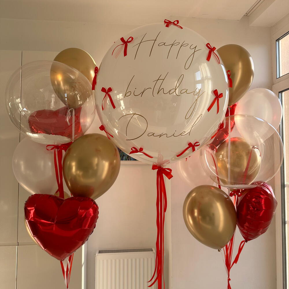Included in the set: 1 crystal ball 70 cm with bows and custom inscription 2 clusters of 8 balloons on satin ribbons (each includes: 2 hearts 45 cm , 3 chrome balloons 30 cm , 1 bubble balloon 60 cm with styrofoam, 2 pearl balloons 30 cm ) 3 weights 3 transport bags Total number of balloons: 17 Filling: All balloons with helium длина, мм: 2000 ширина, мм: 2000 высота, мм: 2000