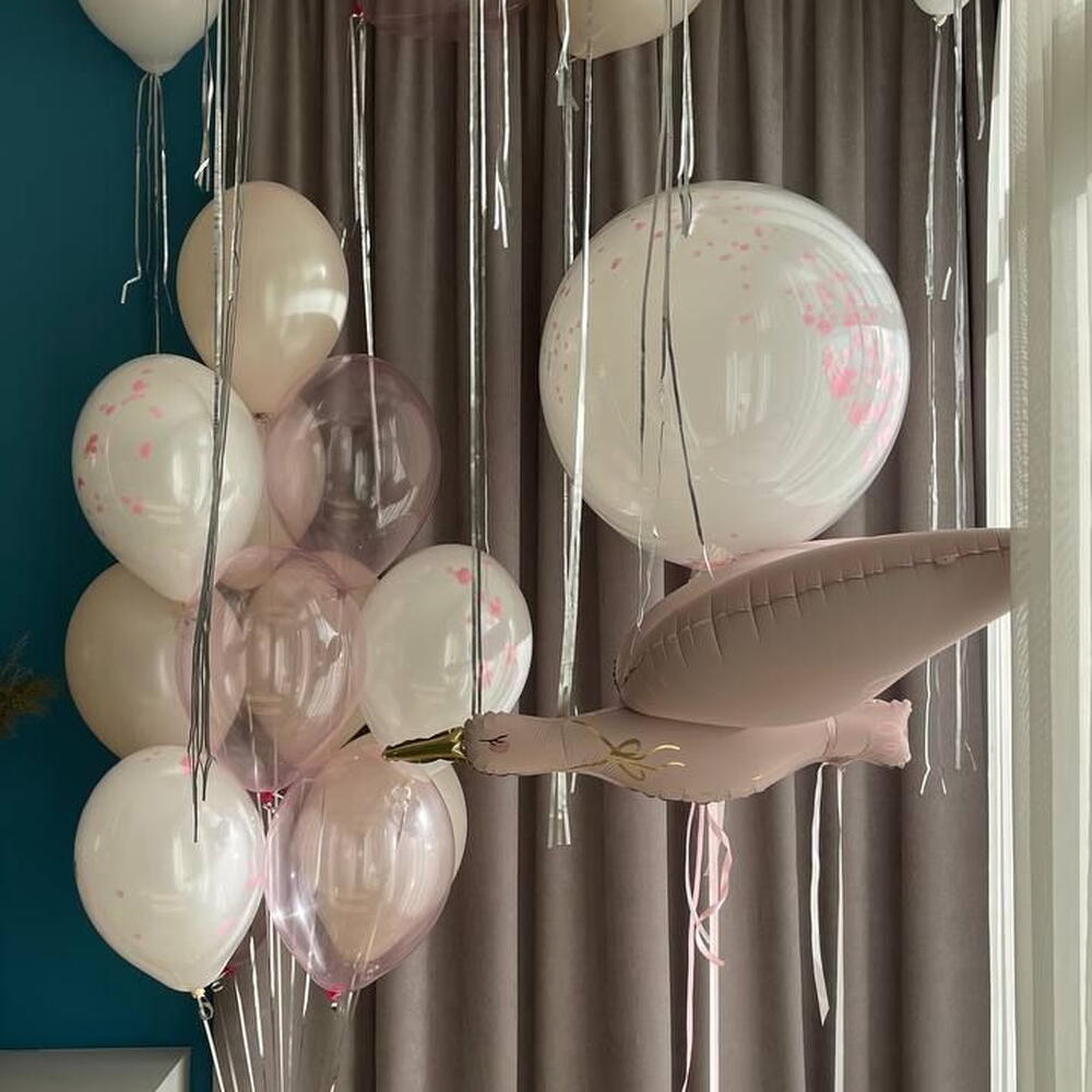 Included in the set: 1 crystal balloon 70cm with confetti and custom inscription 1 figure: stork 1 cluster of 12 balloons ( 3 balloons 30cm white with confetti, 3 balloons 30cm transparent pink, 6 balloons 30cm pastel) 12 ceiling balloons with tinsel ( 3 balloons 30cm transparent pink, 9 balloons 30cm pastel) 3 weights 4 bags for transportation Total number of balloons: 26 Filling: All balloons with helium длина, мм: 2000 ширина, мм: 2000 высота, мм: 2000