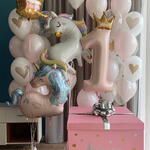 Included in the set: Number with crown Box with bow, inscription and stickers Inside the box 30 mini balloons (float up to 8 hours) 1 figure: crown 2 figures: unicorn 2 bouquets of 3 balloons (each: 3 balloons 30cm pastel) 2 bouquets of 13 balloons (each: 3 balloons 30cm with styrofoam, 4 balloons 30cm with hearts, 9 balloons 30cm pastel) 8 weights 5 bags for transportation Total number of balloons: 65 Filling: All balloons with helium длина, мм: 2000 ширина, мм: 2000 высота, мм: 2000