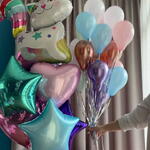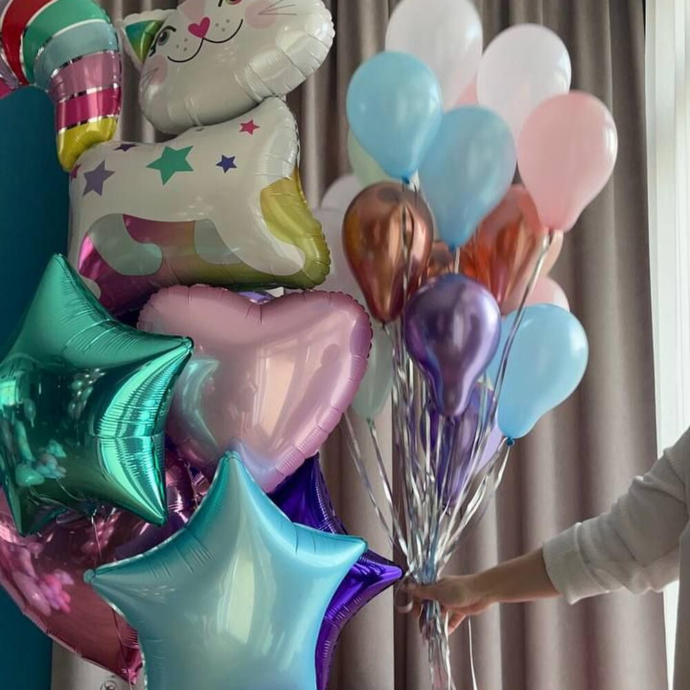 Included in the set: Box with custom inscription and stickers Inside the box: 20 mini balloons (float for up to 8 hours) 1 bouquet of 7 balloons ( 3 hearts 45cm , 3 stars 45cm , figure: cat-unicorn ) 1 weight Total number of balloons: 27 Filling: All balloons with helium длина, мм: 2000 ширина, мм: 2000 высота, мм: 2000