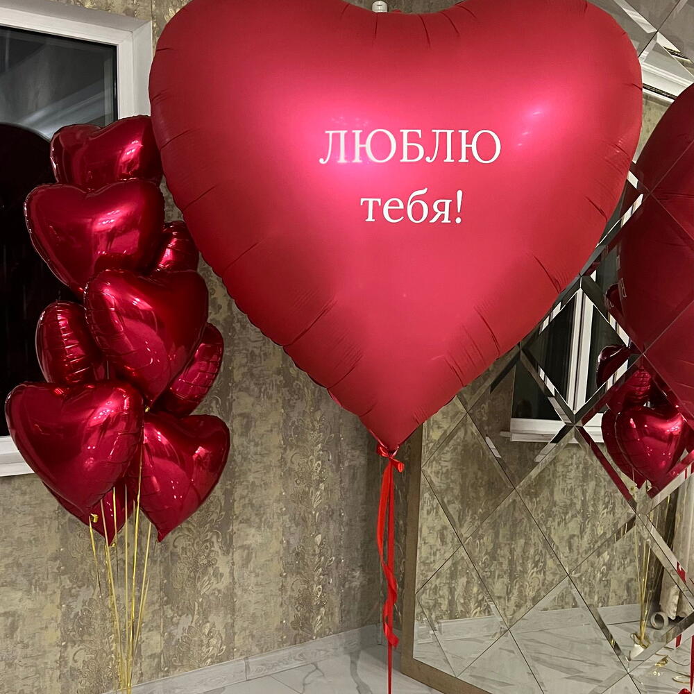 Included in the set: 1 WOW heart 160cm Inscription on the heart of 3-4 words as a gift 1 bouquet of 10 hearts 45cm 2 weights 3 bags for transportation Total number of balloons: 11 Filling: All balloons filled with helium длина, мм: 2000 ширина, мм: 2000 высота, мм: 2000