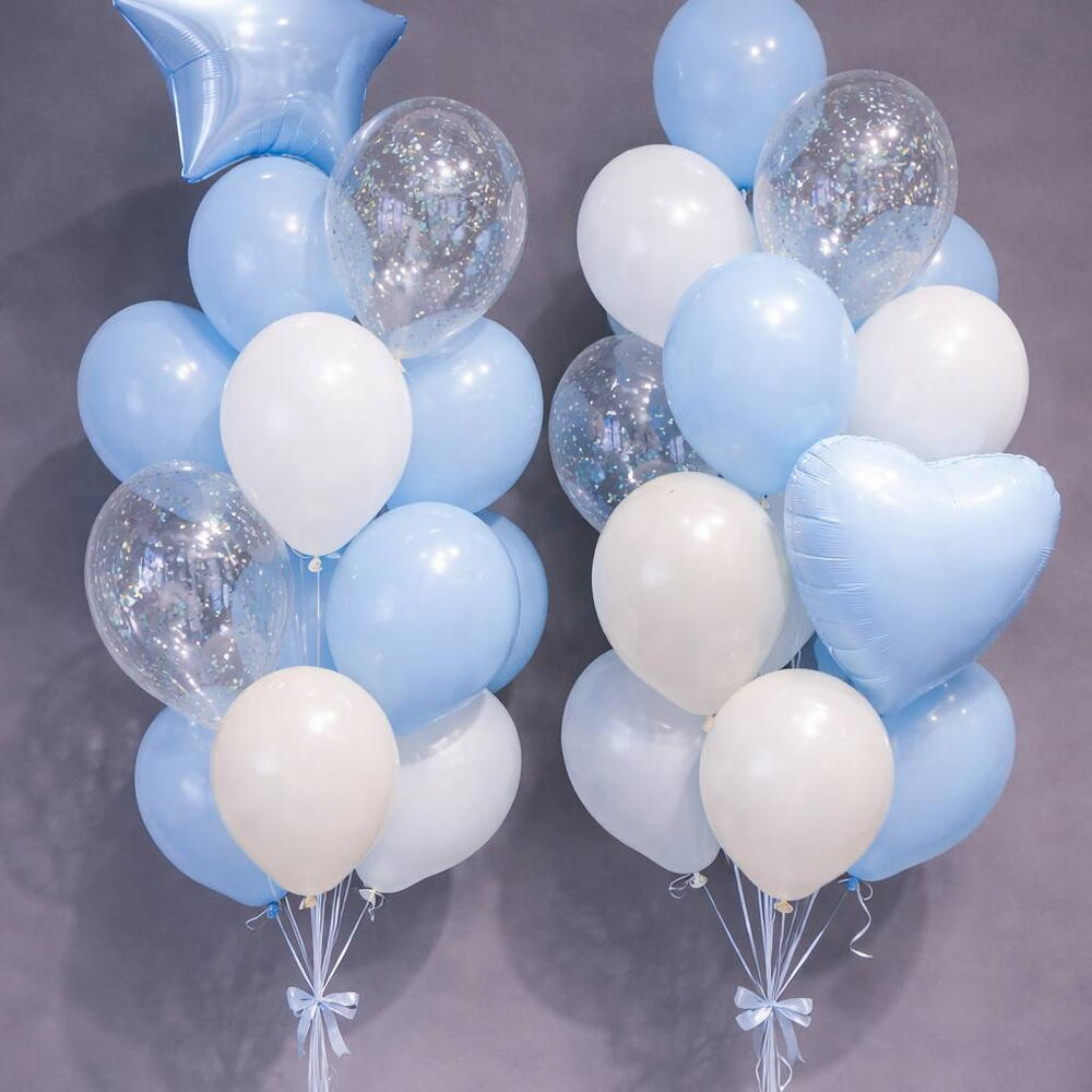 Il set è composto da due bouquet separati, che in totale contengono 22 palloncini. Contenuto del set: 1. Bouquet sinistro (11 palloncini): • 1 x Palloncino in foil: Grande stella azzurra. • 2 x Palloncini trasparenti: Con confetti argentati iridescenti all'interno. • 4 x Palloncini in lattice: Azzurri (pastello). • 4 x Palloncini in lattice: Bianchi (pastello). 2. Bouquet destro (11 palloncini): • 1 x Palloncino in foil: Grande cuore azzurro. • 2 x Palloncini trasparenti: Con confetti argentati iridescenti all'interno. • 4 x Palloncini in lattice: Azzurri (pastello). • 4 x Palloncini in lattice: Bianchi (pastello).
