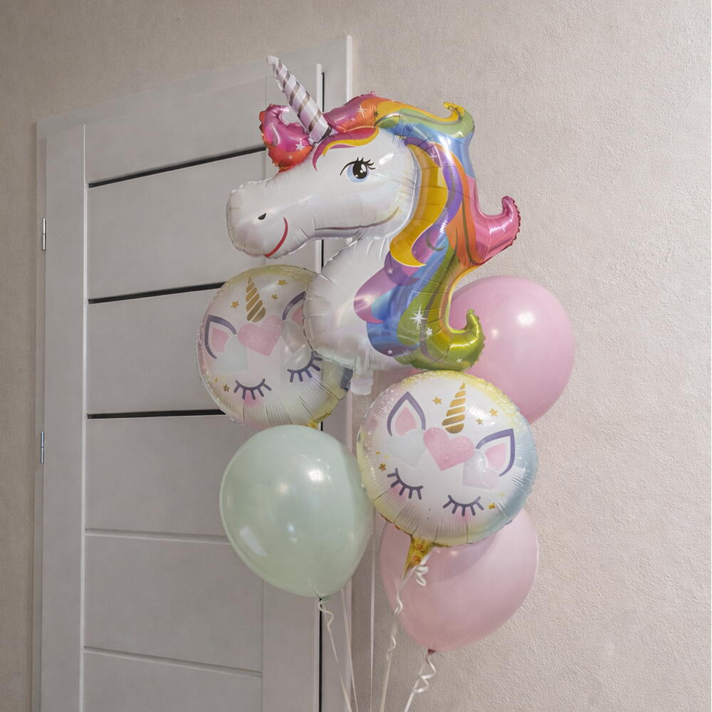 Il set comprende 6 palloncini: • 1x palloncino Unicorno • 2x palloncini rotondi in foglio metallizzato: • 3x palloncini classici in lattice • Accessori: nastri decorativi bianchi che legano il tutto in un set coerente.