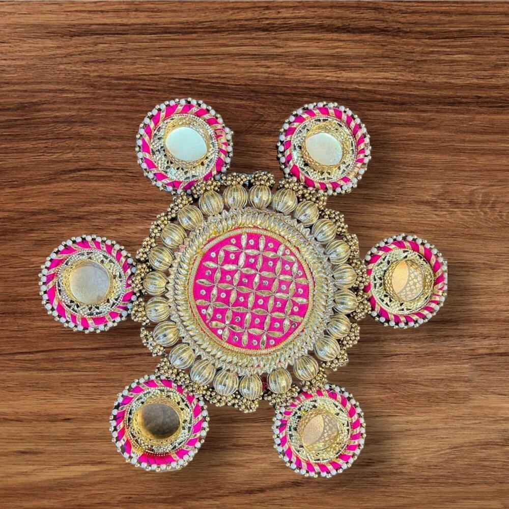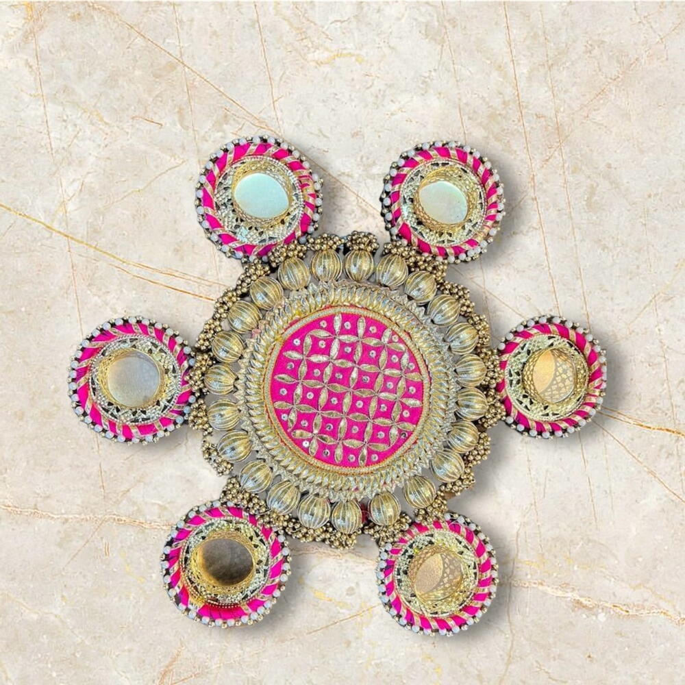 A set of 6 Small candle holders and 1 central rangoli. Festival Decoration Item Single candle holders comes in beautiful gift box You can gift someone for diwali Or Can use to decor your Diwali Or use it as a return gift DECORATION Item 💫 For home Office Karwachauth, Pooja, Diwali, wedding, Haldi, Mehndi etc 👇👇👇👇👇👇👇👇👇👇👇👇 This is a Multi-Purpose Item used for : ▪︎Weeding Decoration ▪︎Haldi and Mehndi Decoration ▪︎Diwali Decoration ▪︎House Entrance Decoration ▪︎Karwachauth Best quality product