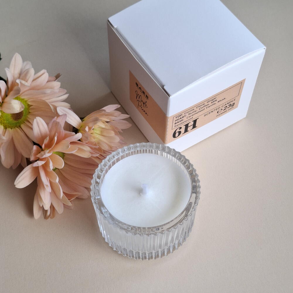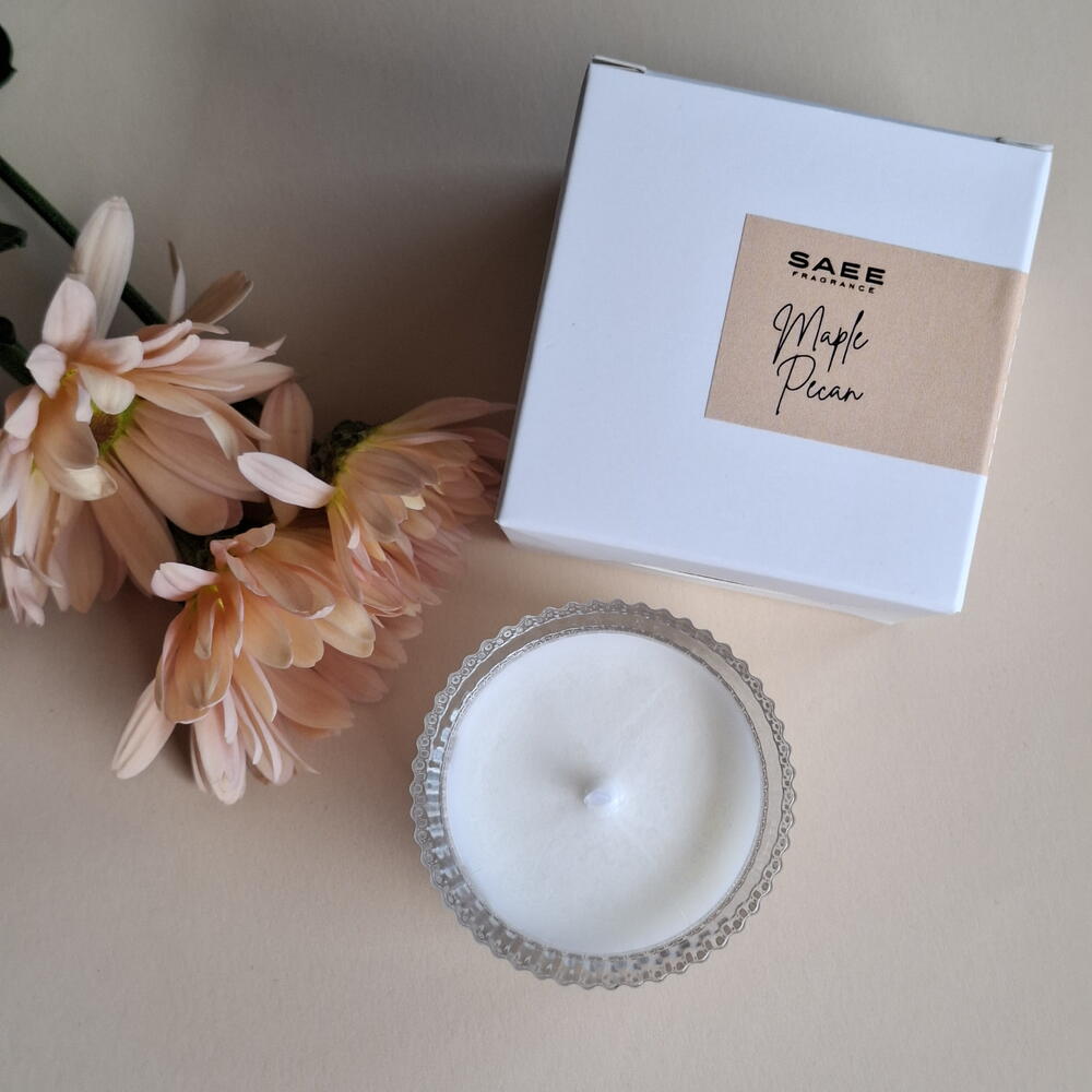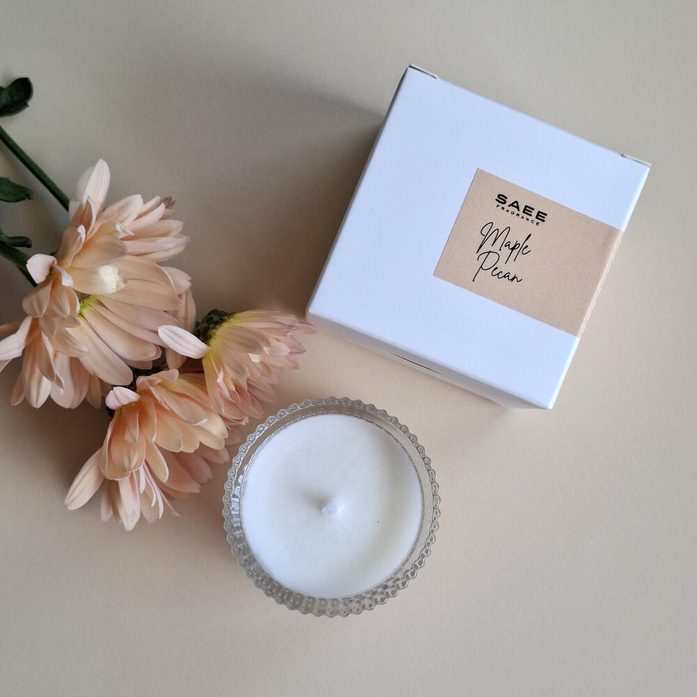 Aromatic soy wax candle with a sweet and cozy Male Pecan scent. Clean burn for up to 6 hours. Perfect for creating a warm and comforting atmosphere.