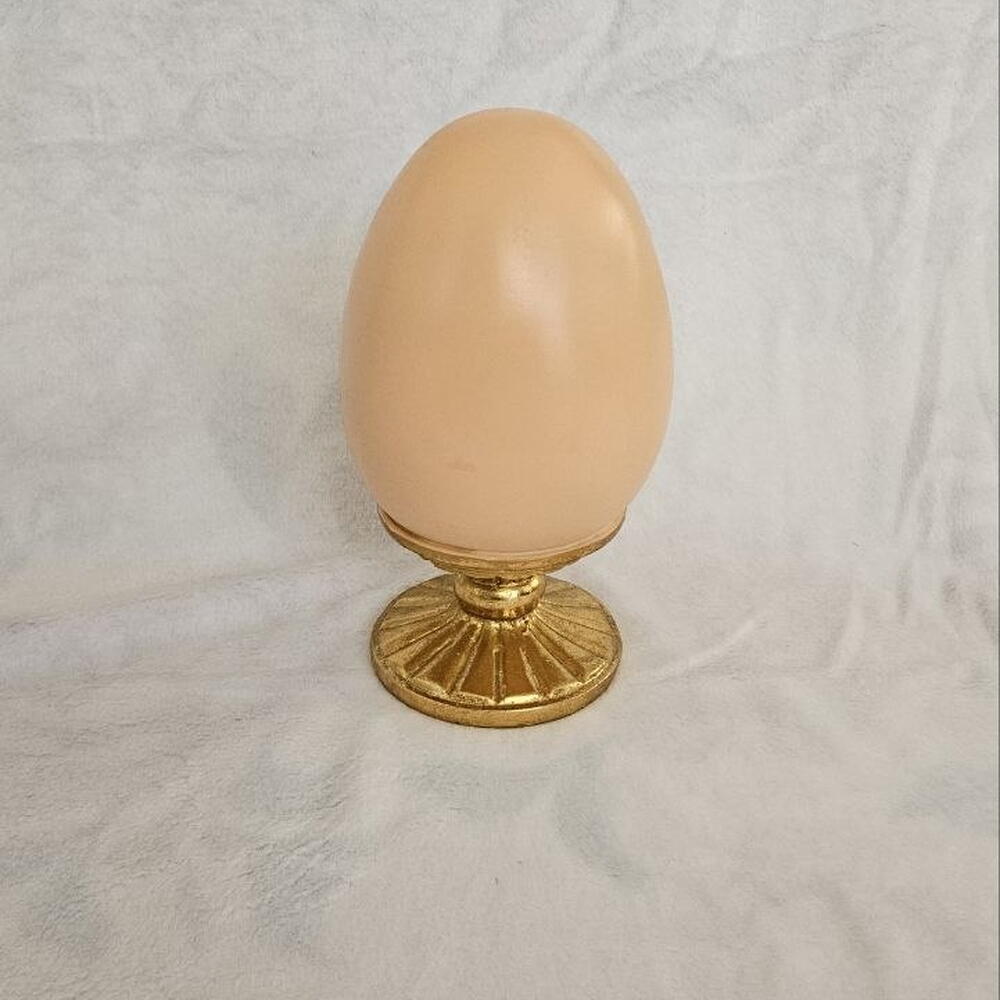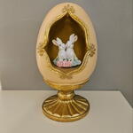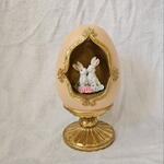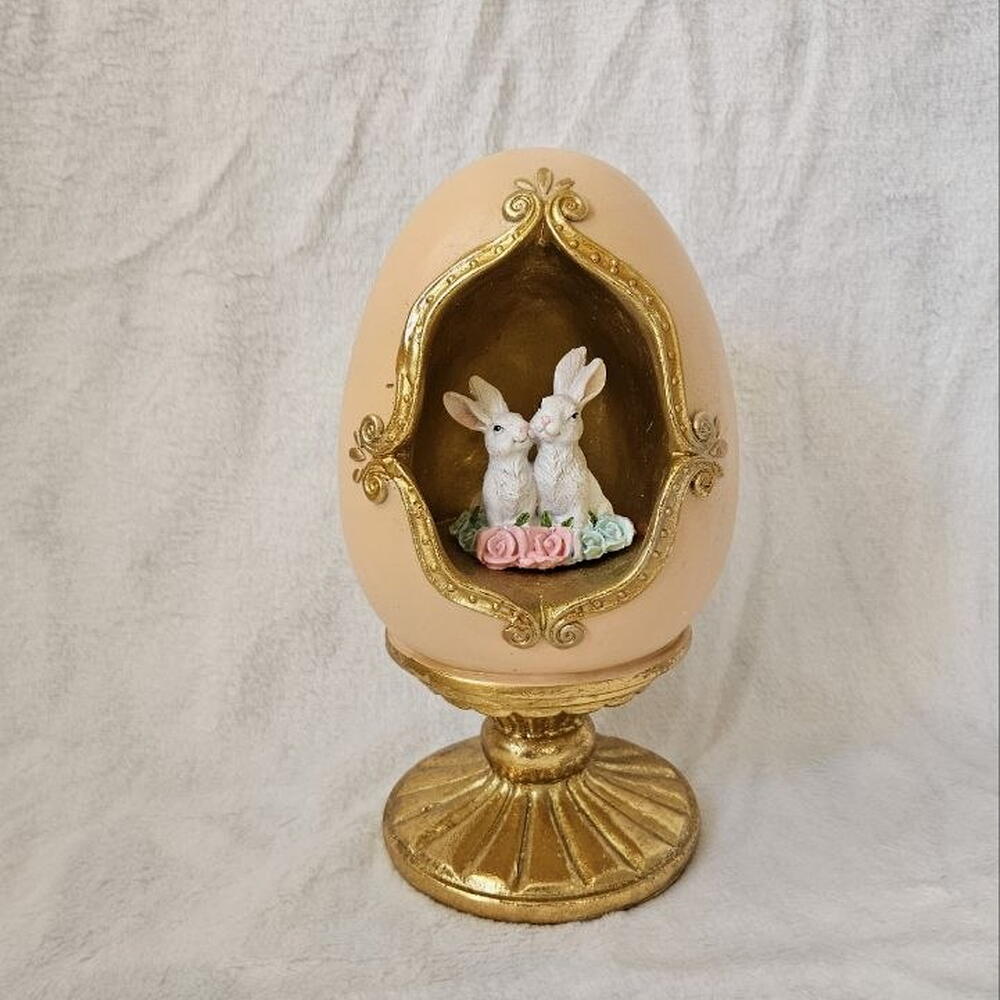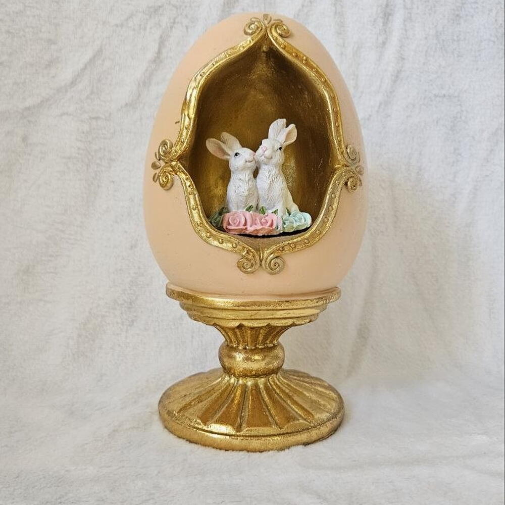 Questa statuetta unica è un connubio di classicità, eleganza e adorabili dettagli. Una coppia di coniglietti che si baciano all'interno di un uovo color pesca con interno dorato. Un connubio di opaco e oro antico. Realizzata in resistente poliresina, con cura per ogni dettaglio (fiori pastello, base scanalata). Ideale come ornamento centrale della tavola di Pasqua o come elegante regalo che sarà ricordato per anni. Dimensioni: circa 19 x 16,5 cm