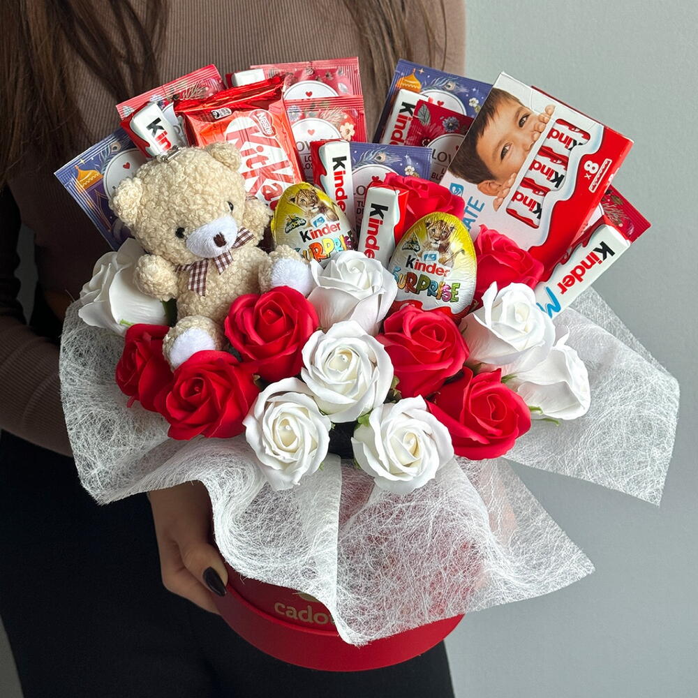 Коробочка состоит из: Коробка красная 15см*15см - 1 штука Розы из мыльно пены белые и красные - 12 штук Плюшевый мишка 8 см - 1 штука Пакетики с чаем разных вкусов - 8 пакетиков Яйцо kinder 20 g - 2 штуки Шоколад Kinder - 100 g - 1 штука Шоколад KitKat 41.5 g - 1 штука Шоколад Kinder maxi - 100 g