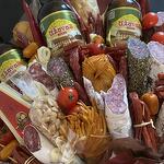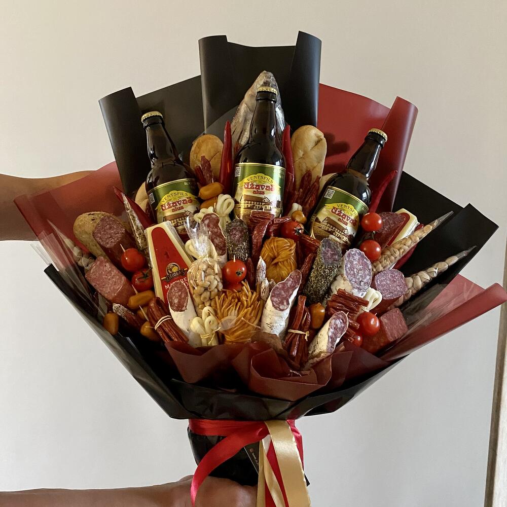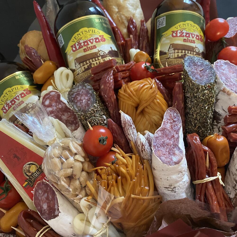 chili pepper - 5 pz peanuts - 50 g cherry tomatoes - 5 pz smoked cheese - 75 g salami - 400 g pistachios - 100 g bread - 3 pz fuet - 360 g garlic baguette - 1 pz chechil cheese - 50 g mini salami - 100 g kabanos - 150 g beer 0.5 - 2 pz big dried fish roach - 1 pz hard cheese - 2 pz chechil cheese 150g - 1 pz sausage with nuts and cheese - 100 g