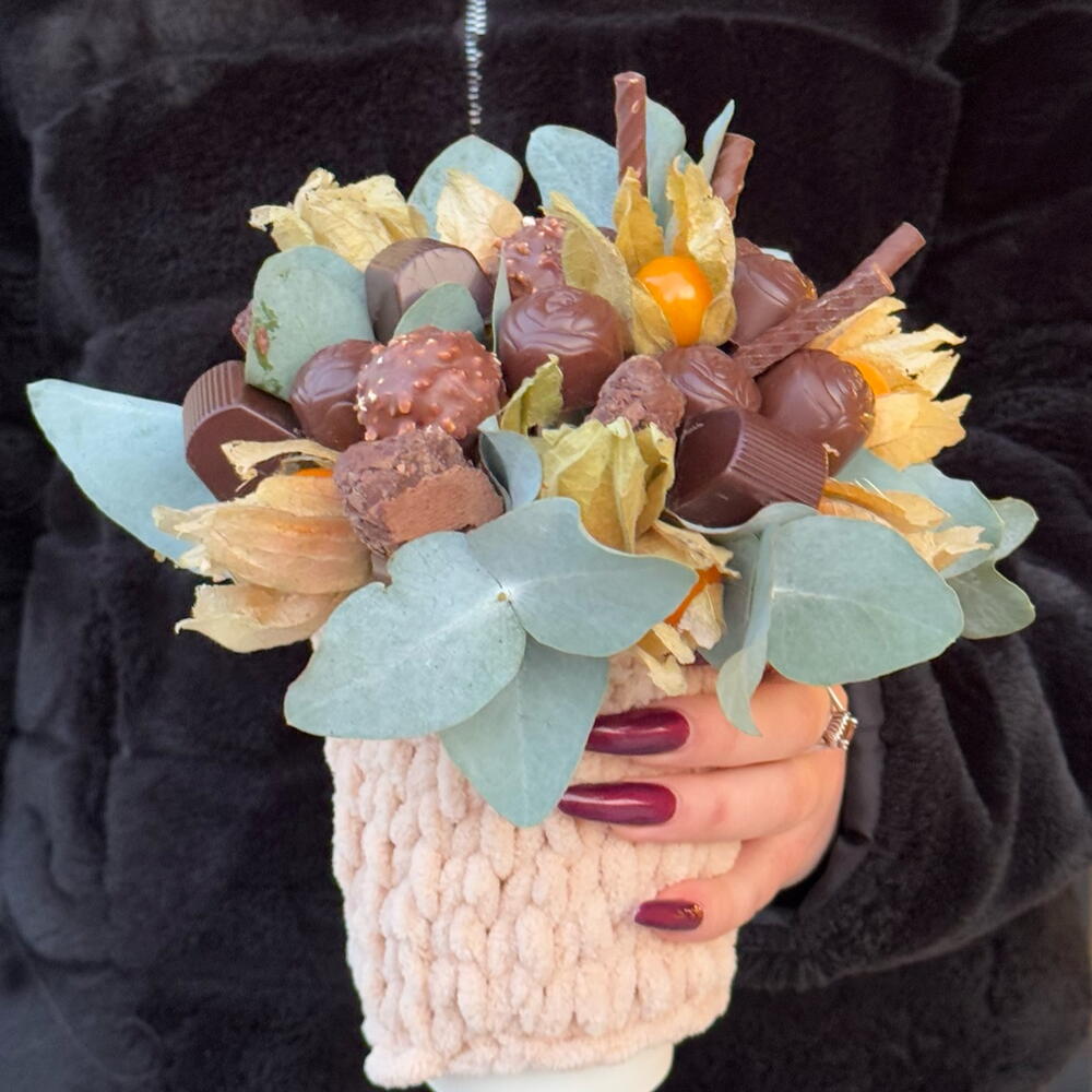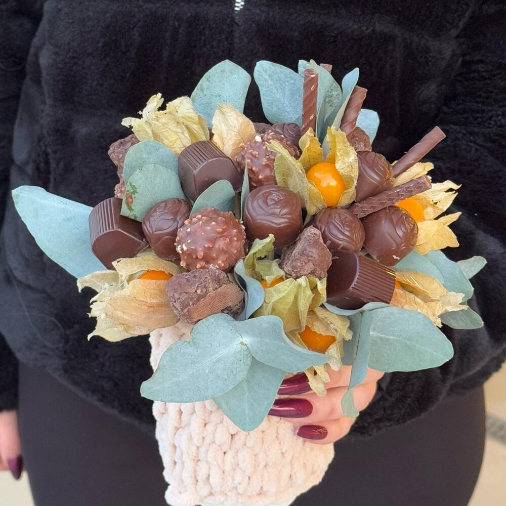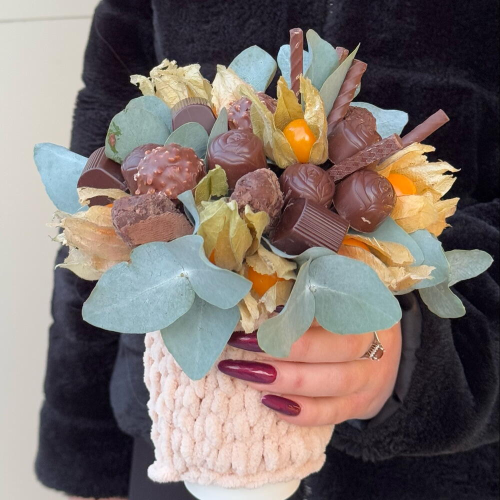 Конфеты Ferrero Rocher - 4 pz Физалис плоды - 15 pz зелень эвкалипта - 2 pz конфеты mon cheri - 4 pz конфеты с ликером адвокат - 11 pz палочки шоколадные соленая карамель - 5 pz