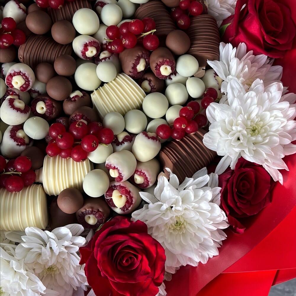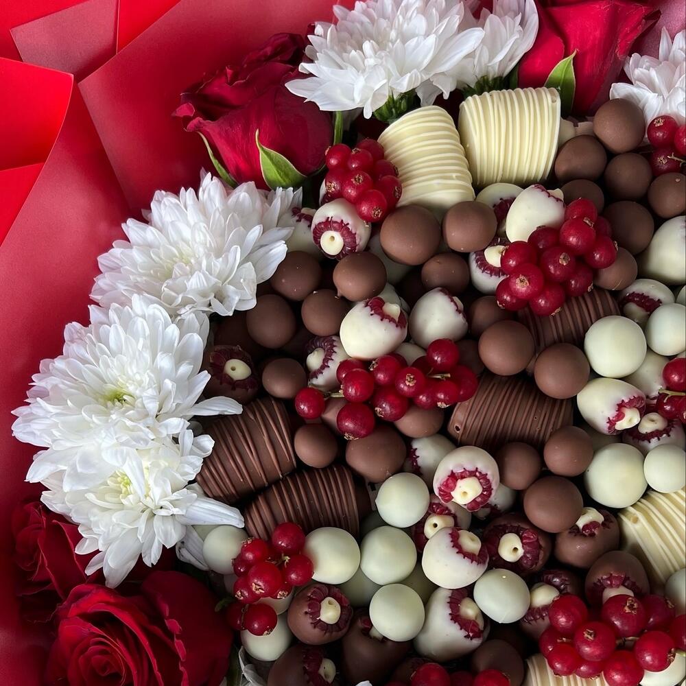 rose - 7 pz banana - 300 g raspberry - 250 g cioccolato belga - 900 g bluberries - 250 g chrysanthemum branch - 5 pz