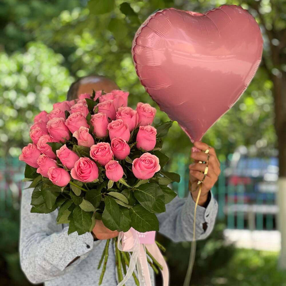 31 розовая роза, шар сердце