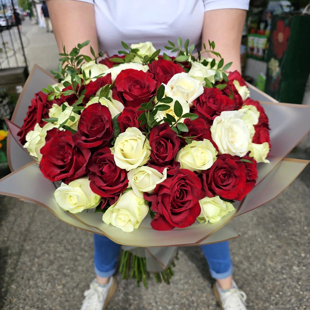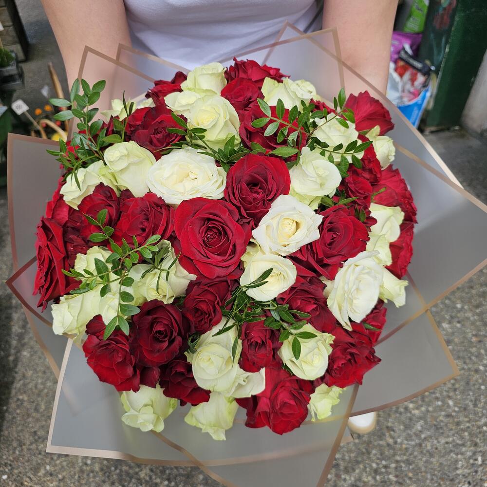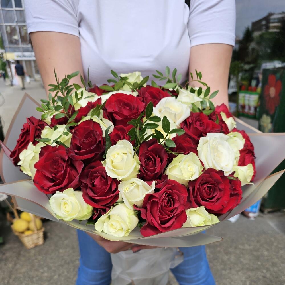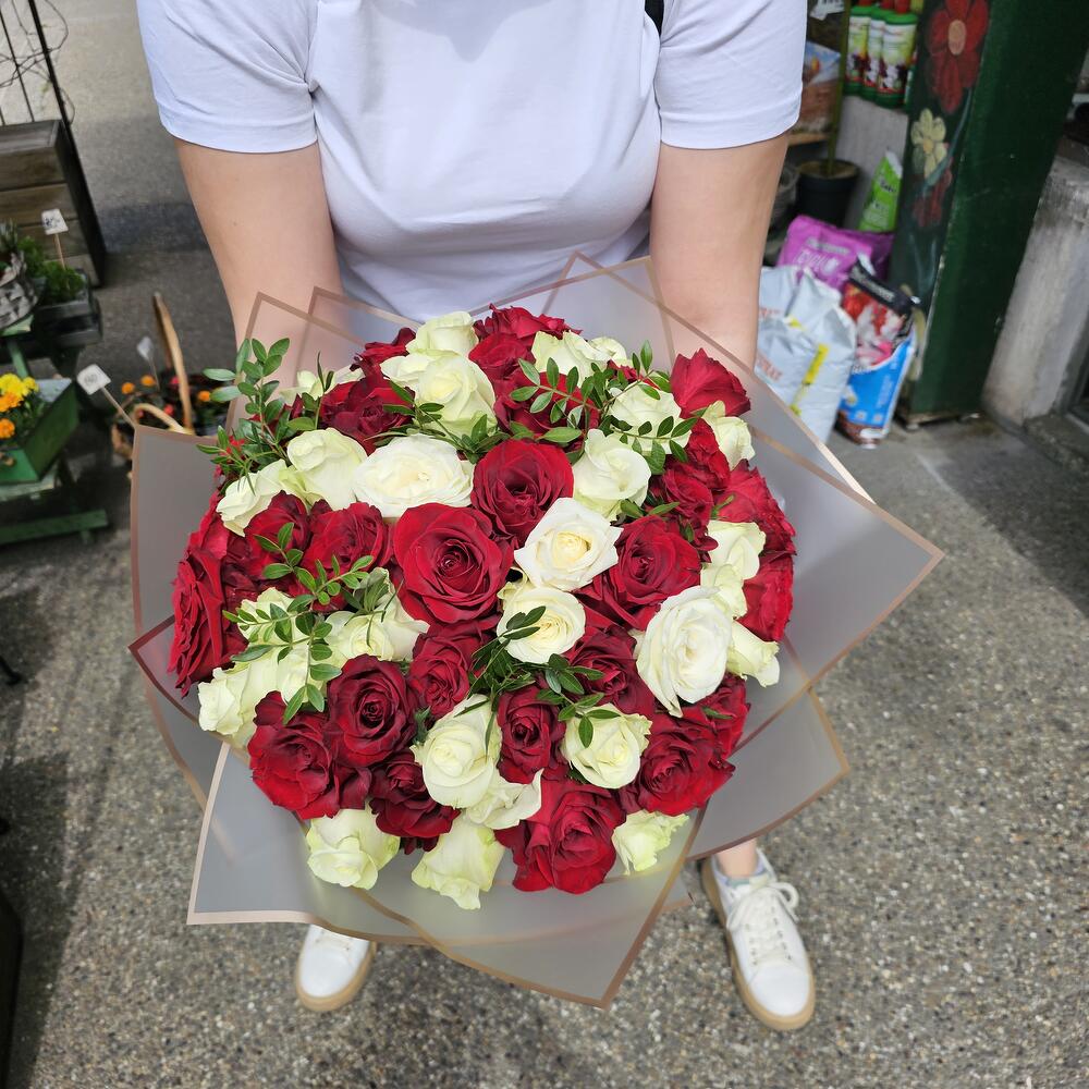 Nastro di raso - 1 pz pistachio leaves - 5 pz roses red and white - 51 pz paper wraping - 1 pz