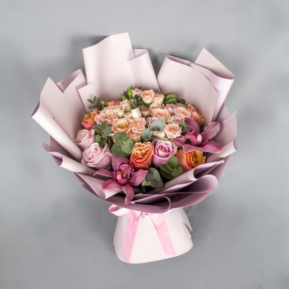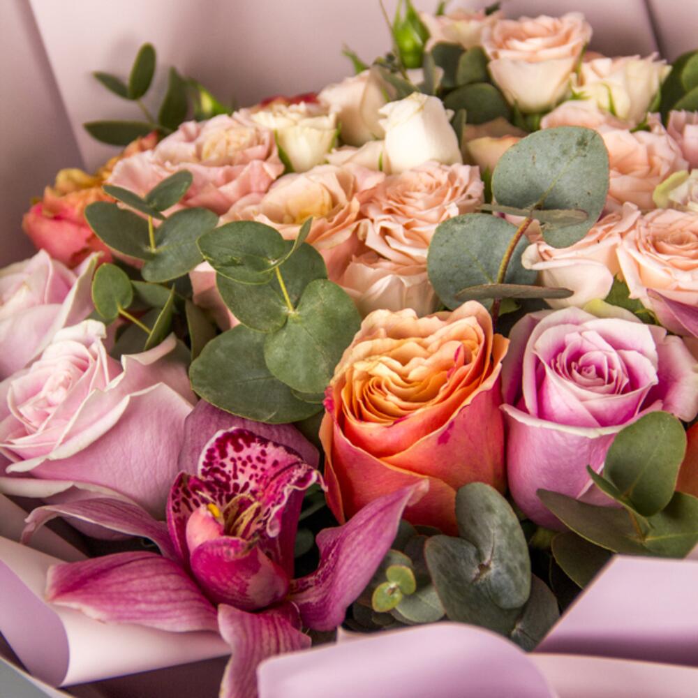 orchidee cymbidium - 2 pz eucalyptus leaves - 5 pz roses - 15 pz rose spray - 10 pz