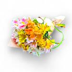 Ramo simples com 10 pés de Alstroemerias de várias cores embrulhado em papel pardo e atado de ráfia.