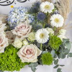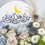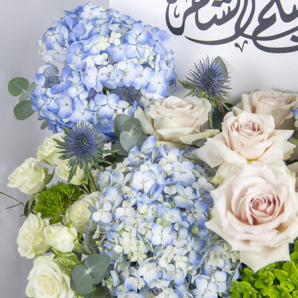 Elegant Ramadan floral arrangement with blue hydrangeas and soft roses.