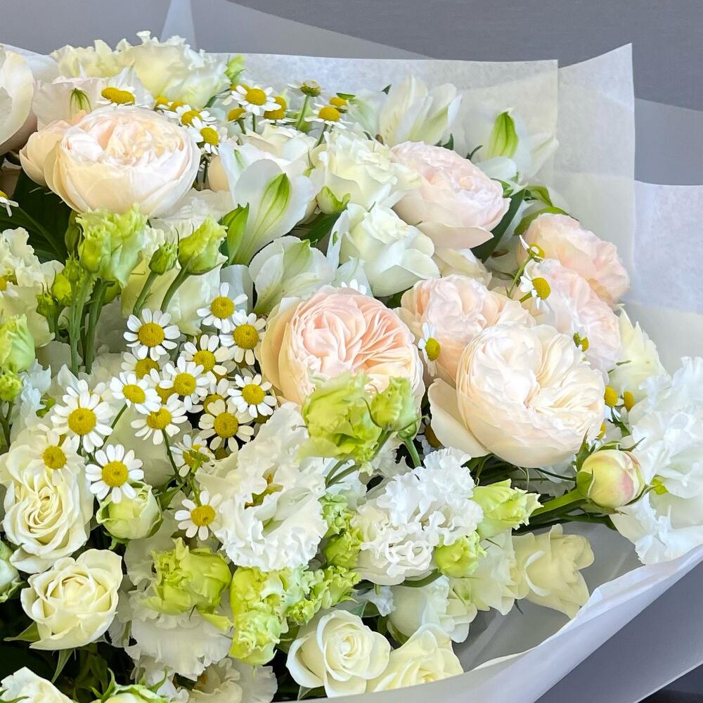 Nastro di raso - 1 pz imballaggio - 1 pz white alstroemeria - 3 pz rosa arbustiva bianca - 7 pz matricaria - 7 pz eustoma bianco - 5 pz peach bush rose - 5 pz