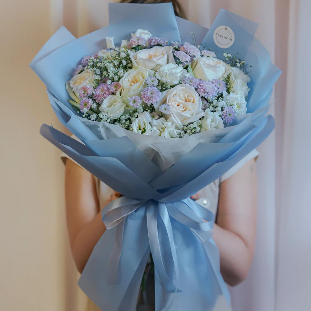carta da regalo - 1 pz eustoma bianco - 3 pz purple santini - 6 pz white gypsophilia - 3 pz rose bianche - 5 pz