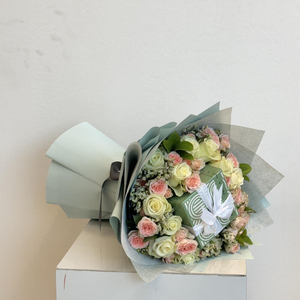 ورود - 12 pz خضرة - 5 pz ليمونيوم - 4 pz علبة شوكولاتة patchi - 1 pz ورود صغيرة - 15 pz