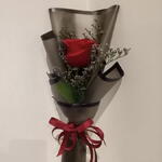 1حبة روز جوري أحمر كلاسيكي ببتلات مخملية نضرة. - 1 pz 3 أغصان صغيرة من زهور "الستاتيس" (statice) المجففة باللون الأبيضالموف الفاتح لإضافة تباين بصري. - 3 pz 5 طبقات من الورق الكوري الفاخر (نصف شفاف) باللون الأسود المطفأ (matt black). - 5 pz 1شريط ساتان ناعم باللون الأحمر القاني (burgundy) مربوط بأسلوب الفراشة المزدوجة. - 1 pz