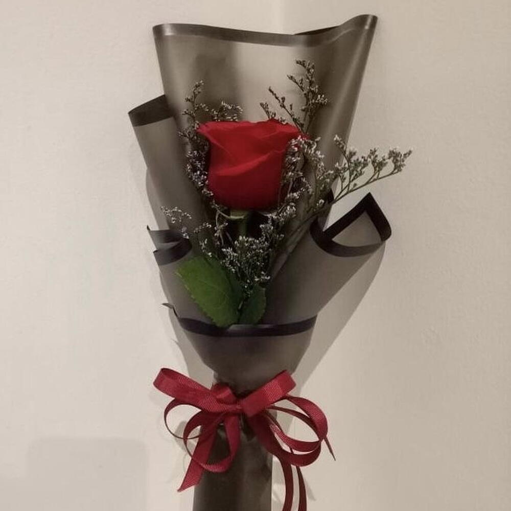 1حبة روز جوري أحمر كلاسيكي ببتلات مخملية نضرة. - 1 pz 3 أغصان صغيرة من زهور "الستاتيس" (statice) المجففة باللون الأبيضالموف الفاتح لإضافة تباين بصري. - 3 pz 5 طبقات من الورق الكوري الفاخر (نصف شفاف) باللون الأسود المطفأ (matt black). - 5 pz 1شريط ساتان ناعم باللون الأحمر القاني (burgundy) مربوط بأسلوب الفراشة المزدوجة. - 1 pz