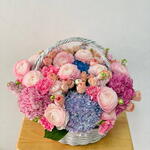 A luxurious flower basket with hydrangeas, delicate ranunculus, and harmoniously selected seasonal blooms. This lush arrangement looks voluminous and elegant, creating the feeling of a true flower garden. This gift will be a stunning addition to any celebration and will provide unforgettable emotions.