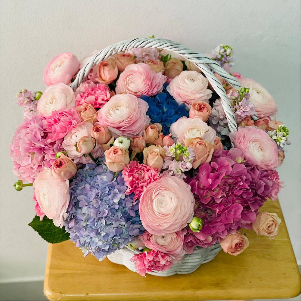 A luxurious flower basket with hydrangeas, delicate ranunculus, and harmoniously selected seasonal blooms. This lush arrangement looks voluminous and elegant, creating the feeling of a true flower garden. This gift will be a stunning addition to any celebration and will provide unforgettable emotions.